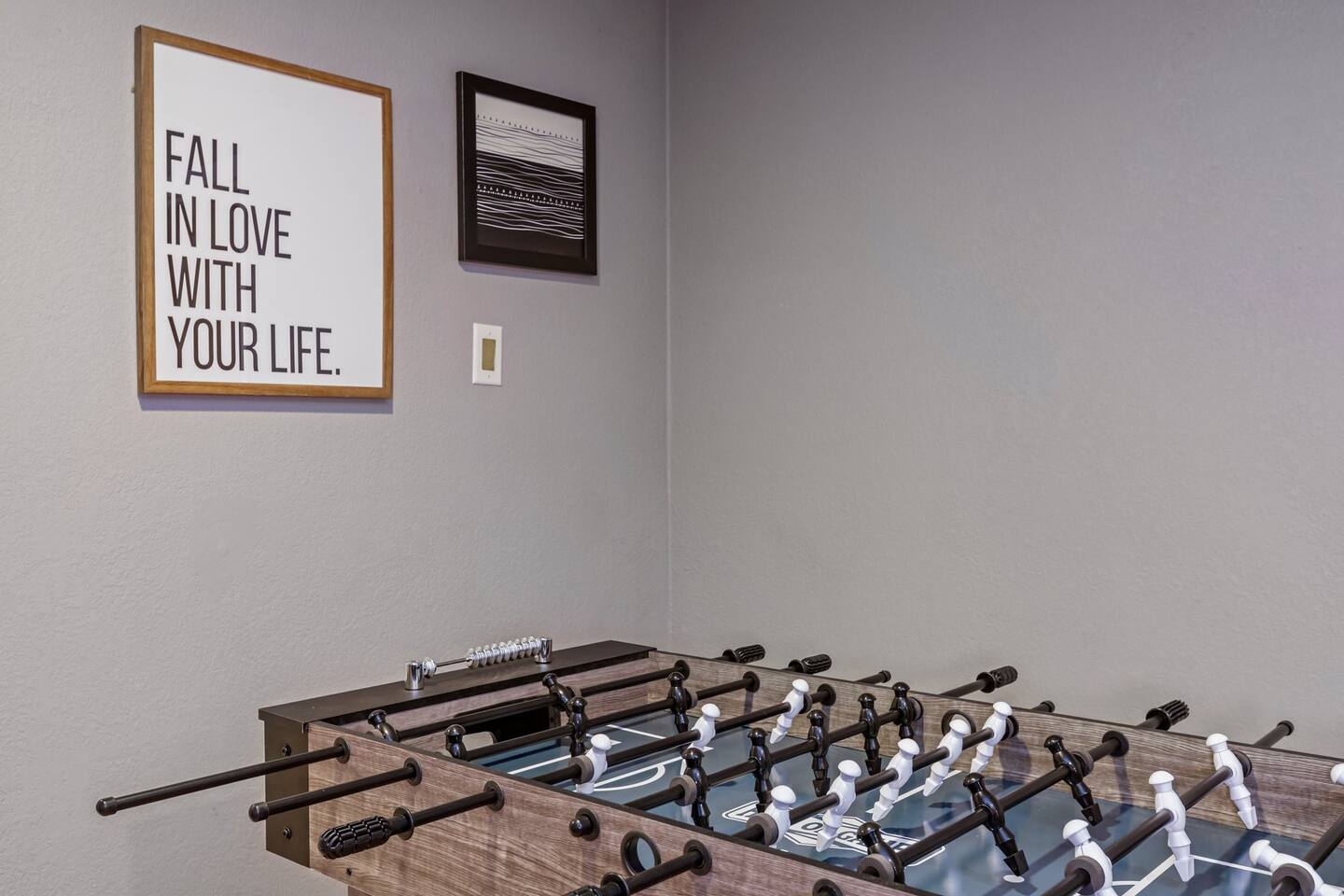 The downstairs living area features a dartboard, foosball table, board games, and a flat-screen TV.