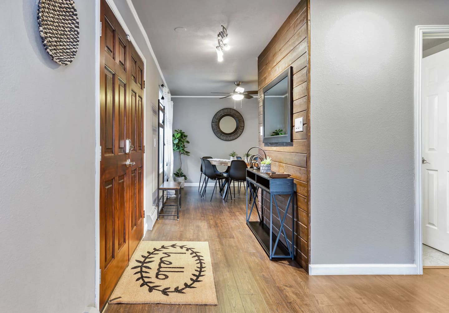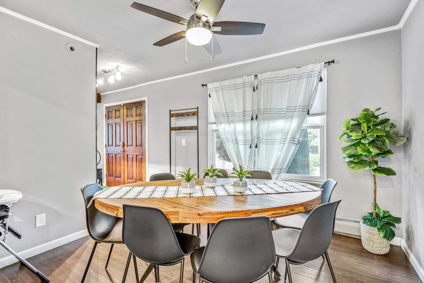 The main floor of this spacious Bohemian home boasts a renovated kitchen, a living room, dining room, and a half bathroom. The living room features a full-size couch, and a flat screen TV with streaming options.