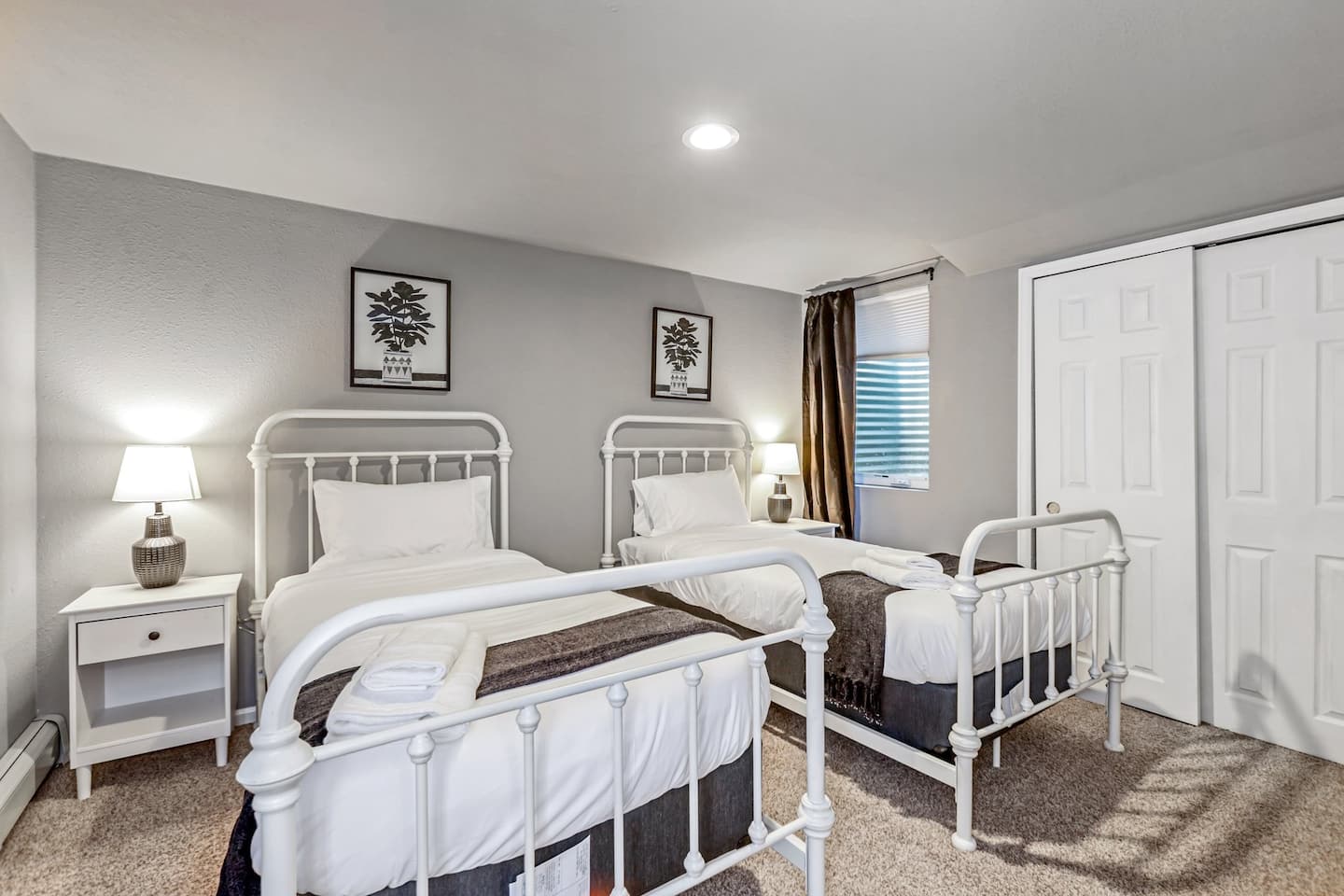 Bedroom #5 is located in the basement and includes two twin-size beds, a closet, and nightstands.