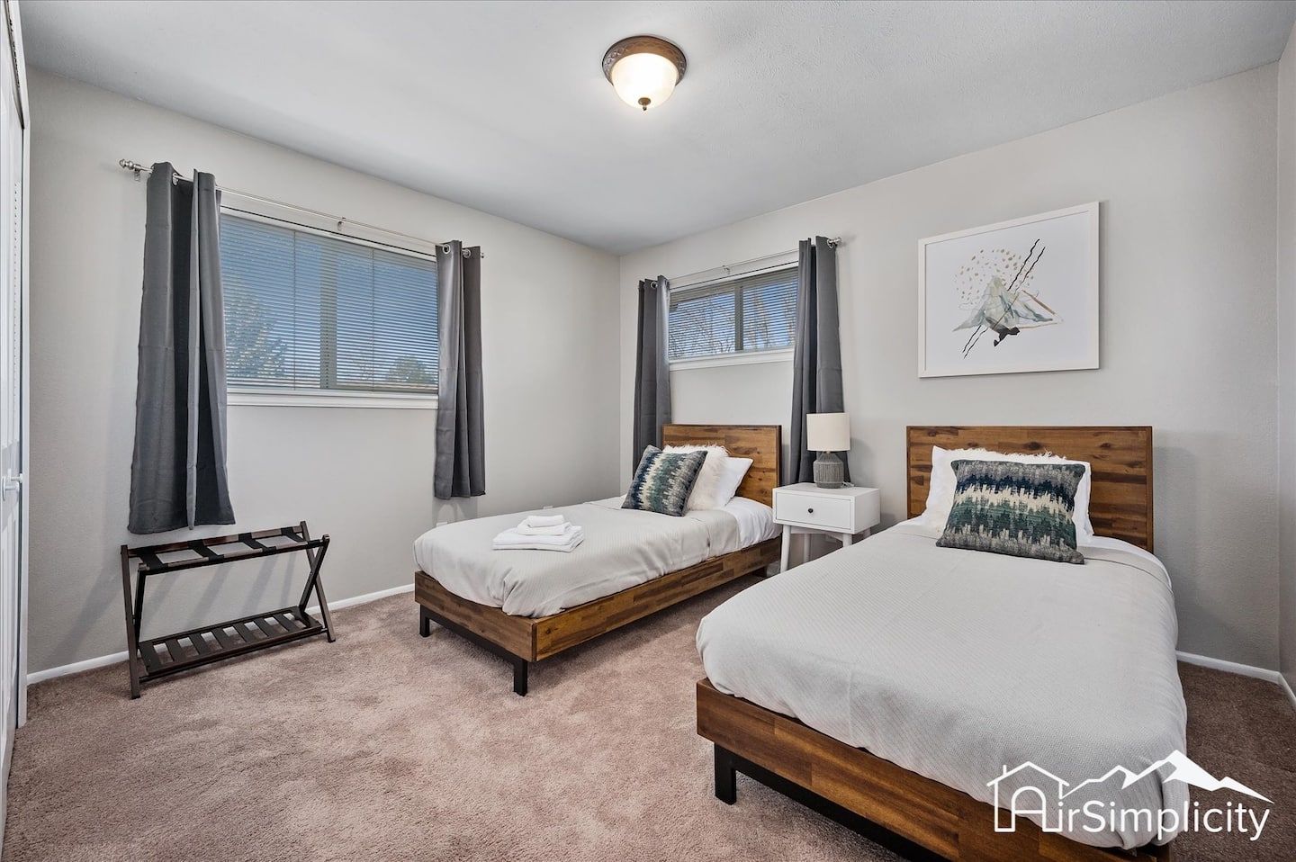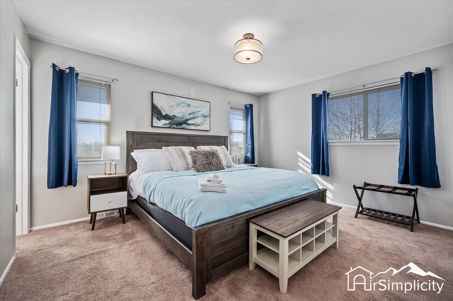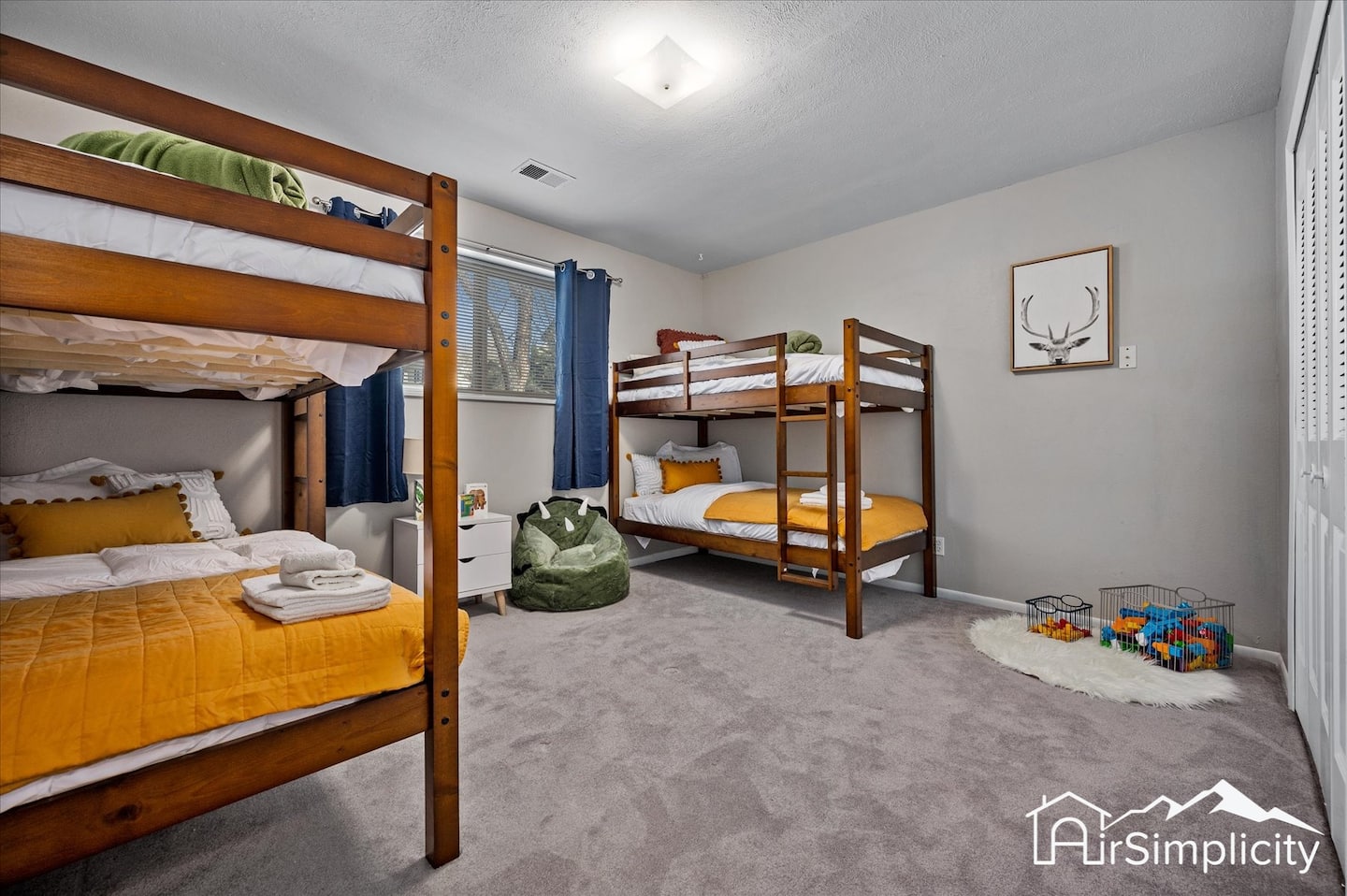 Five bedrooms and nine beds comfortably accommodate up to twelve guests. The master suite includes a king bed and private ensuite bathroom. A second bedroom has two twin beds, and a third is furnished with a full-size bed. On the lower level, a queen bedroom is paired with a bunk room that holds two sets of twin bunks. Each bedroom includes linens, blackout curtains, and thoughtful touches to encourage restful nights.