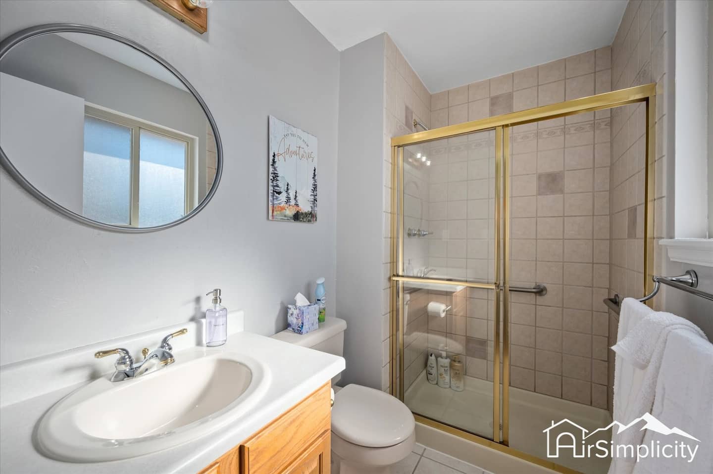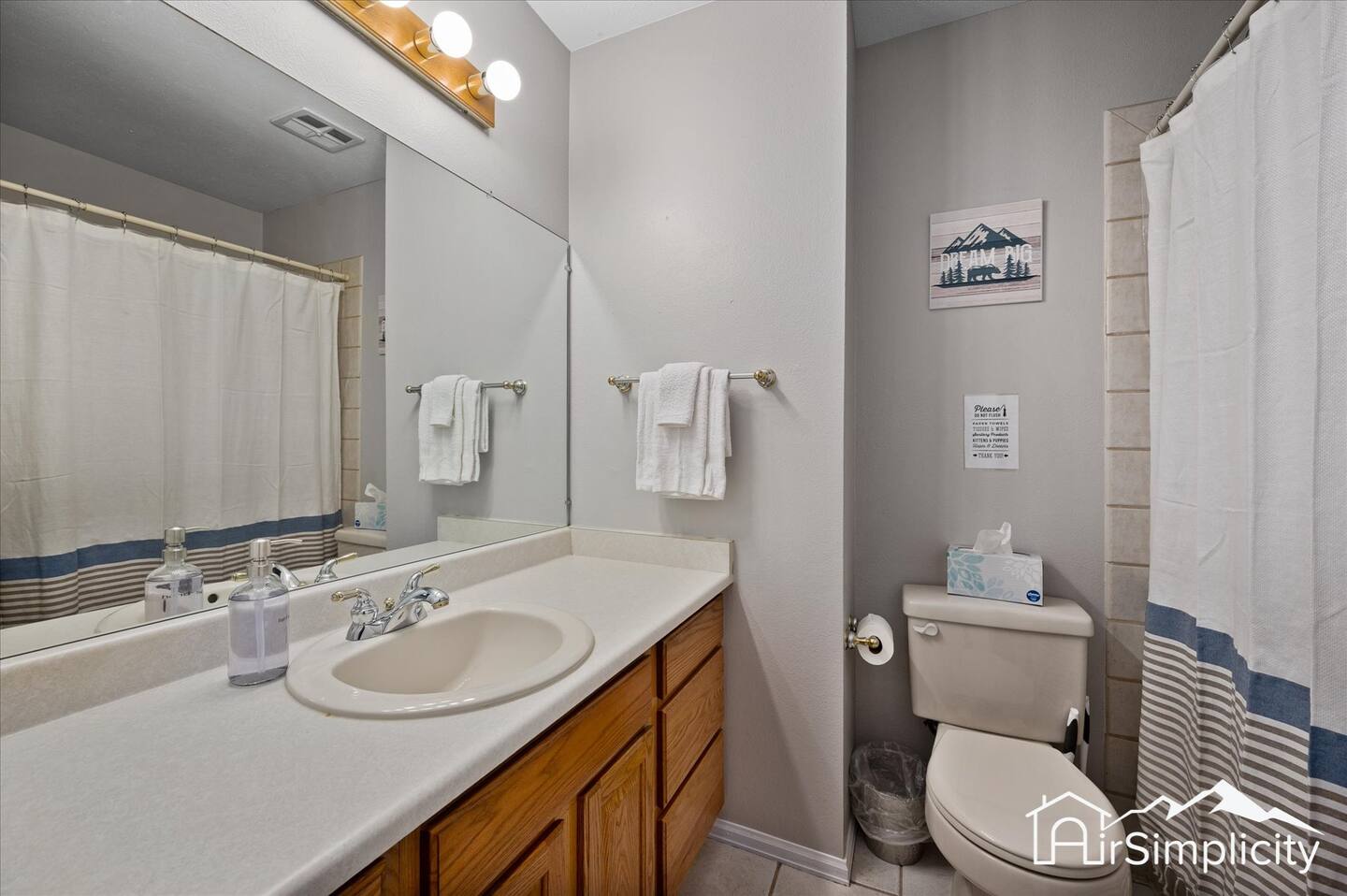 With three bathrooms, there is convenience for every guest. The ensuite bath in the master suite provides privacy, while a second full bathroom upstairs serves nearby bedrooms. A third full bath on the lower level is easily accessed from the queen and bunk rooms. Each space is equipped with either a walk-in shower or tub-shower combination, along with spacious vanities, hot water, and fresh towels.