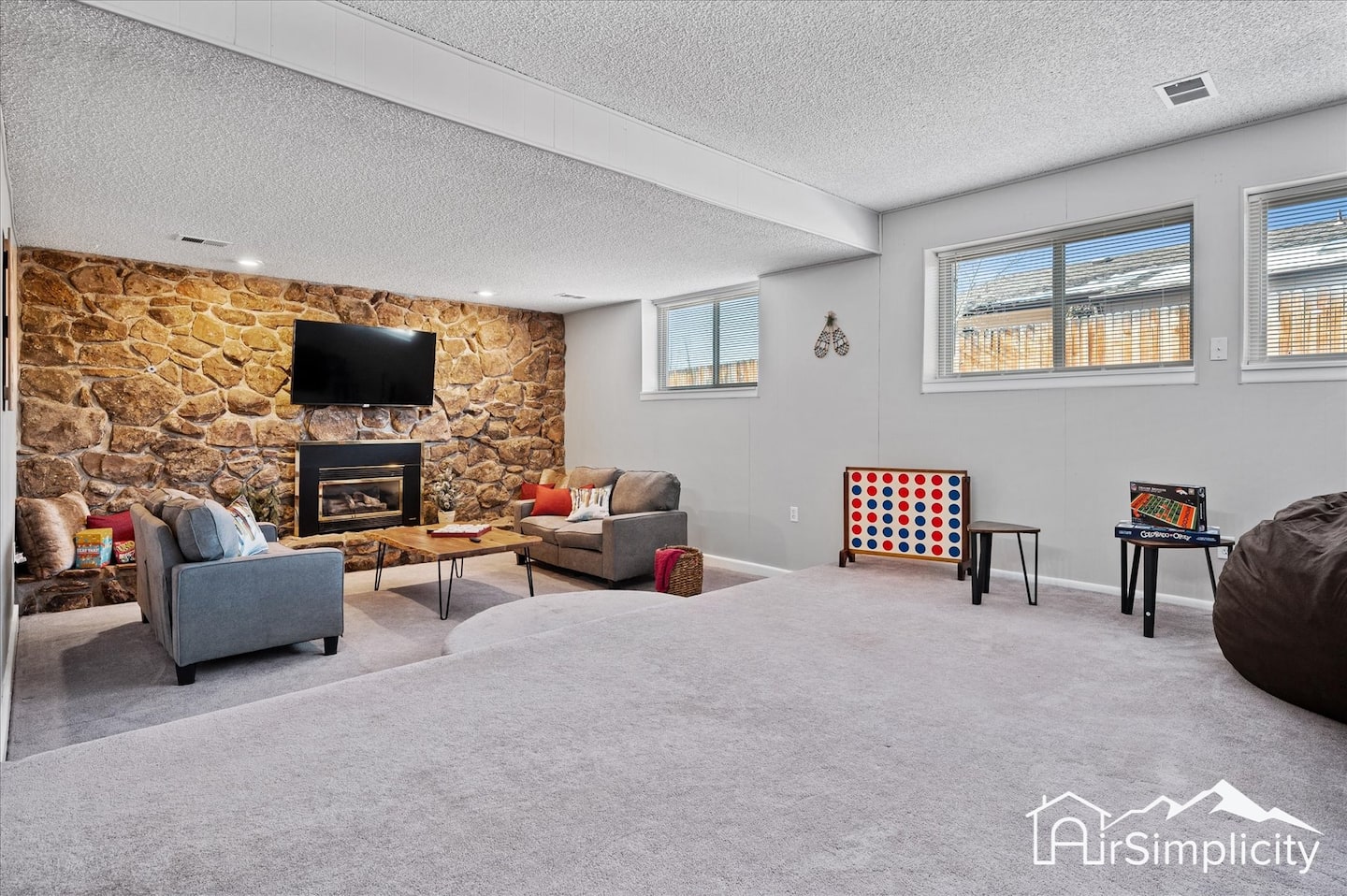 The main living room is bright and welcoming, with a plush sectional and large windows. An open layout connects seamlessly to the dining area with seating for six and a kitchen designed for everyday cooking. Stainless steel appliances, a smart refrigerator, and a stocked coffee station make meal prep simple, while sliding doors open to the deck for outdoor dining. On the lower level, a second living area offers space for games and movies, featuring a foosball table, oversized bean bags, a 55-inch smart TV, and family-friendly board games.