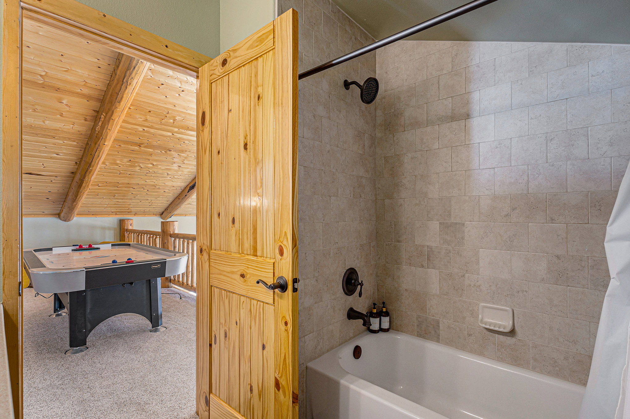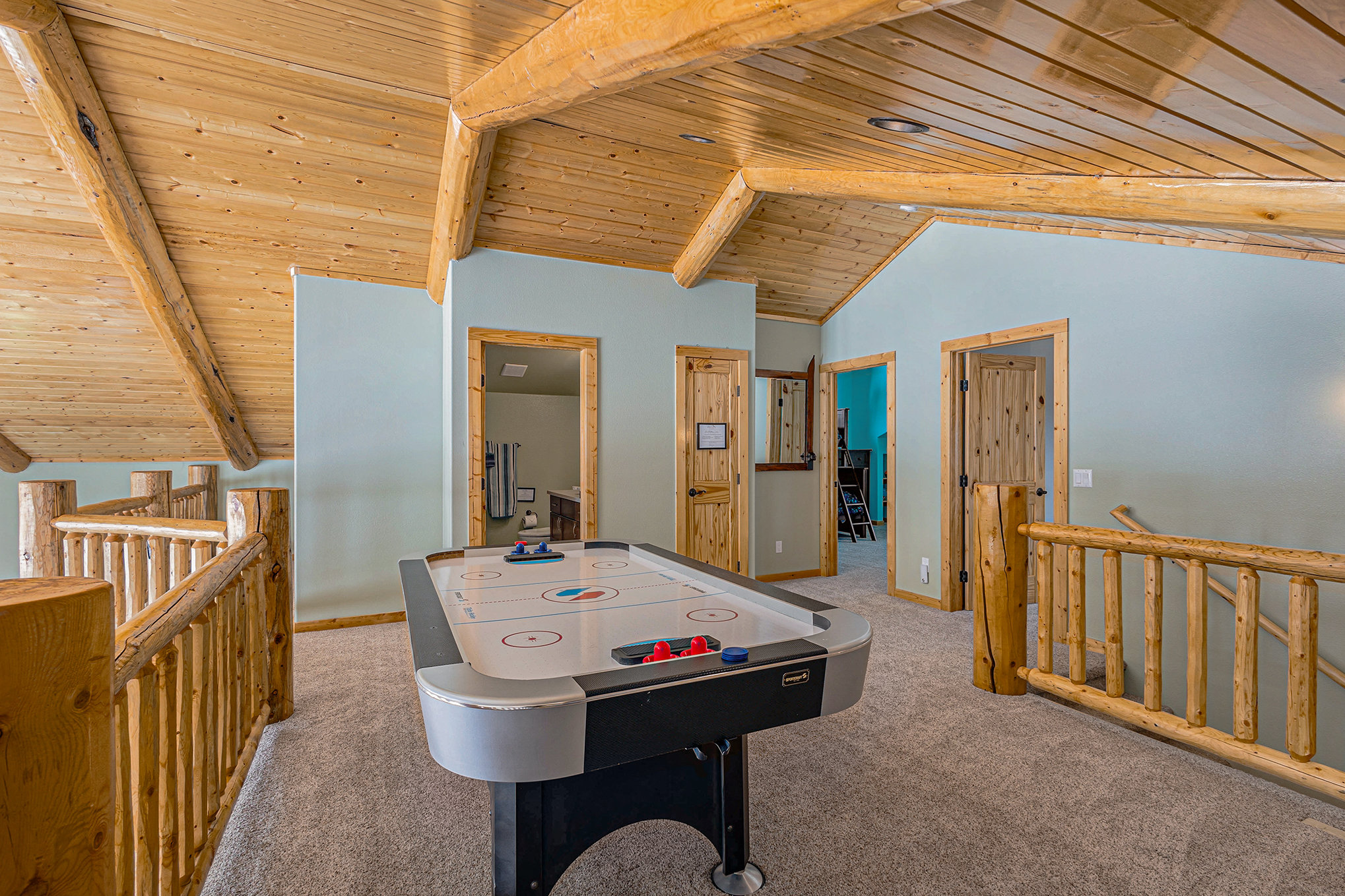 On the third floor, the loft game room welcomes you, offering an overlook of the floor below and stunning views through the windows. The game room features a checkerboard table and an air hockey table. Here, inflate a queen air mattress or unfold the yellow chairs for kid sleeping spaces. A hallway bathroom with a shower/tub combo is available. Off the loft, discover two bedrooms.