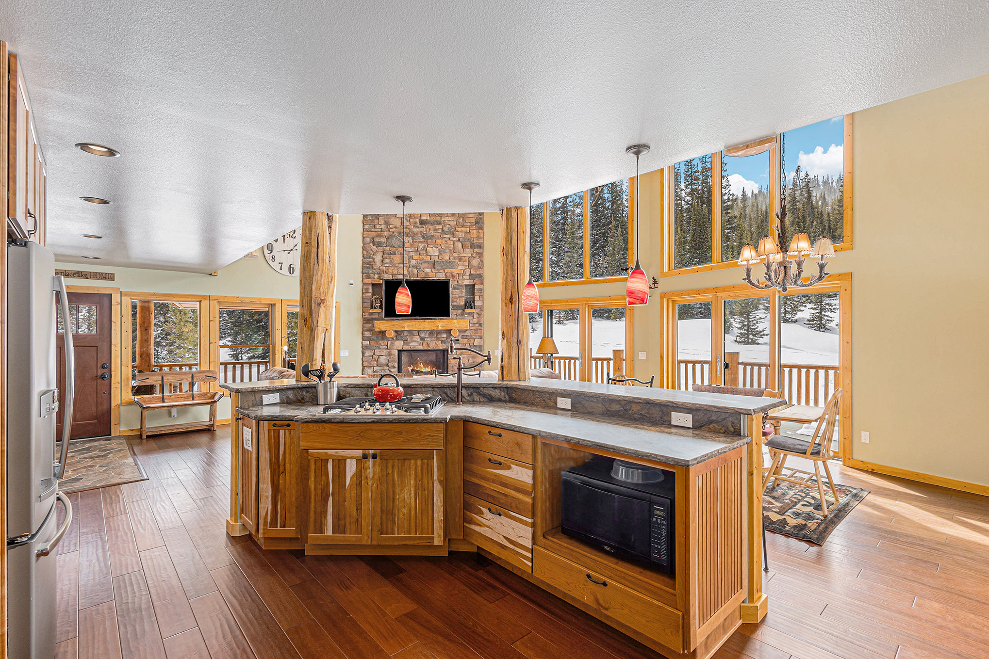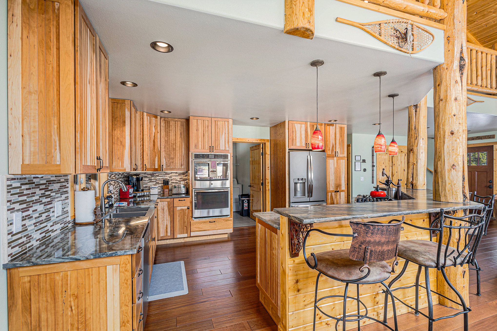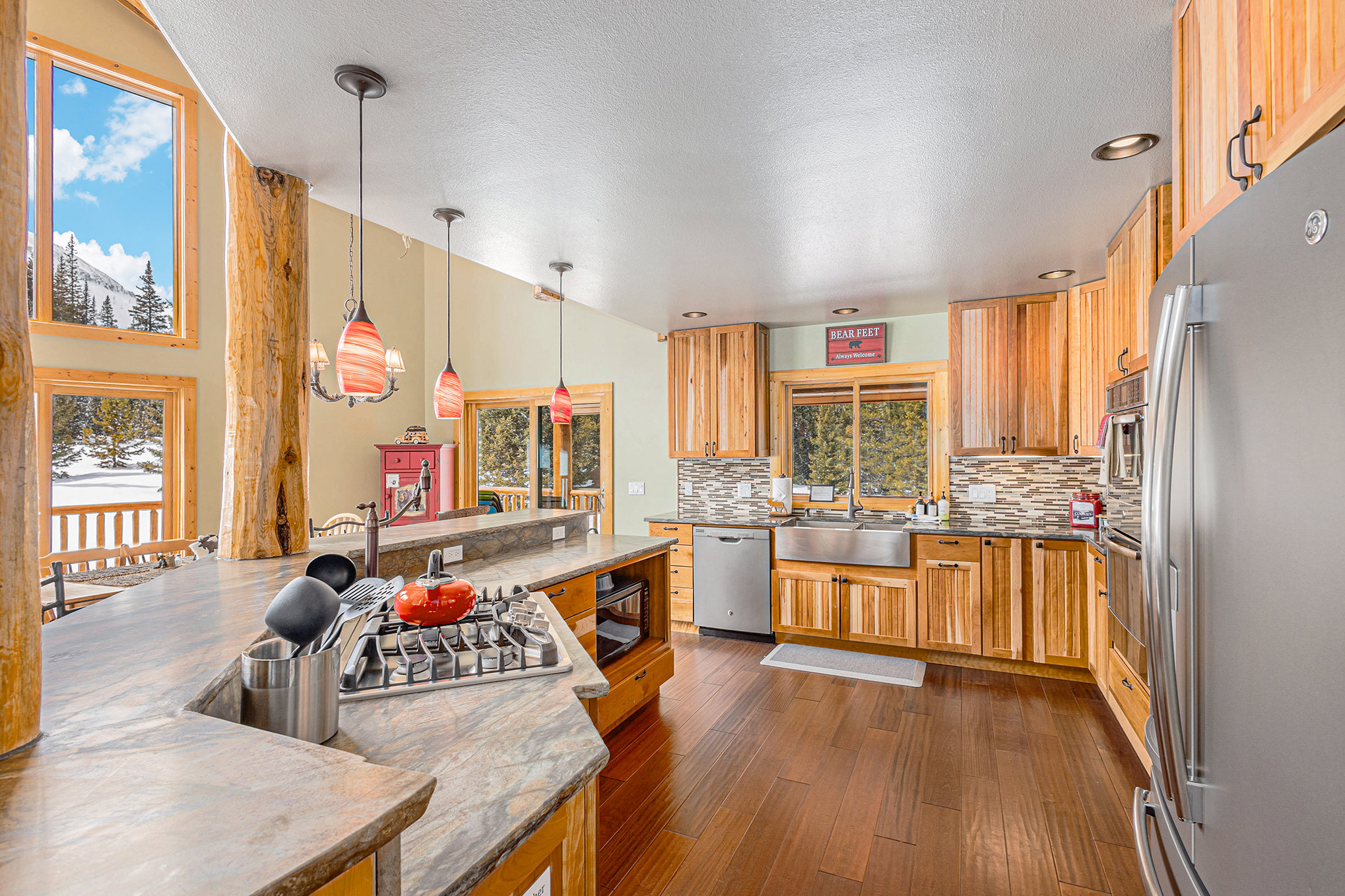 Greeted by floor-to-ceiling windows with stunning mountain views, you will feel surrounded by the evergreens. A dining table and bar area offer seating for up to 10. The fully equipped kitchen awaits. Keurig coffee maker, tea, and cooking basics provided. The living room features a gas fireplace and a TV, and stepping outside leads to a wrap-around deck. The laundry room off the kitchen includes a washer dryer and various dog amenities. A half bathroom is also found off the kitchen.