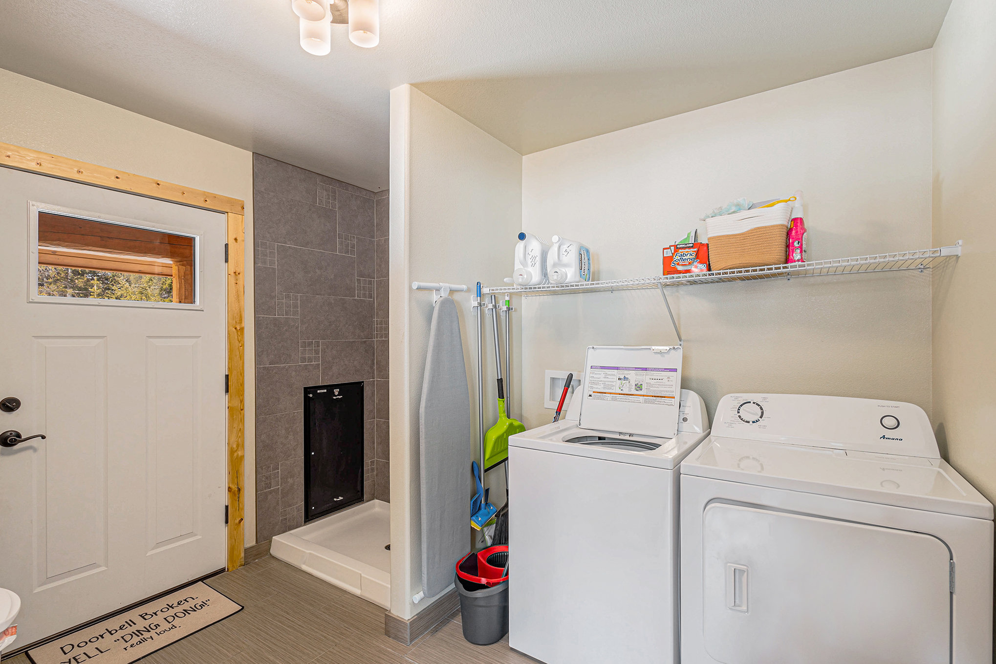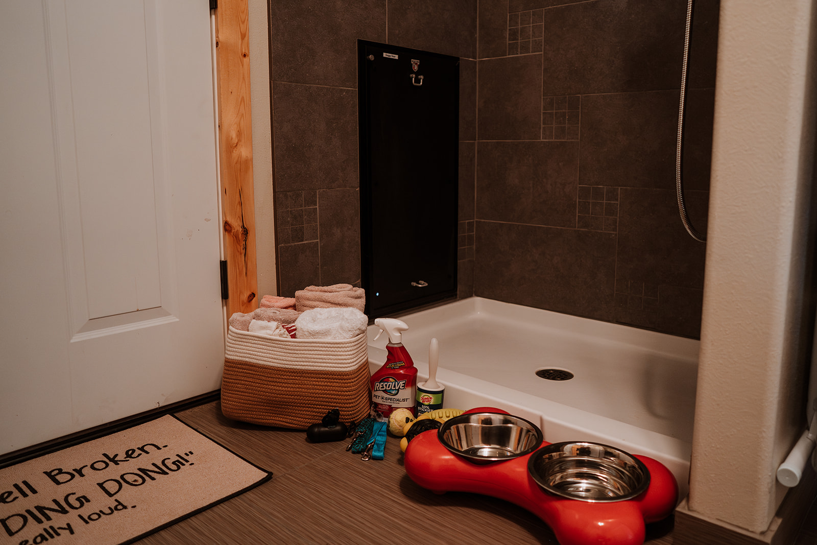 In the laundry room open the doggy door to a dedicated dog run, allowing your dogs to go out without ever leaving the warmth of the cabin. Dogs return inside directly to the dog washing station. Dedicated pet towels, food and water bowls, leashes, poop bags, and several dog beds are provided. Just register and bring your furry friend!