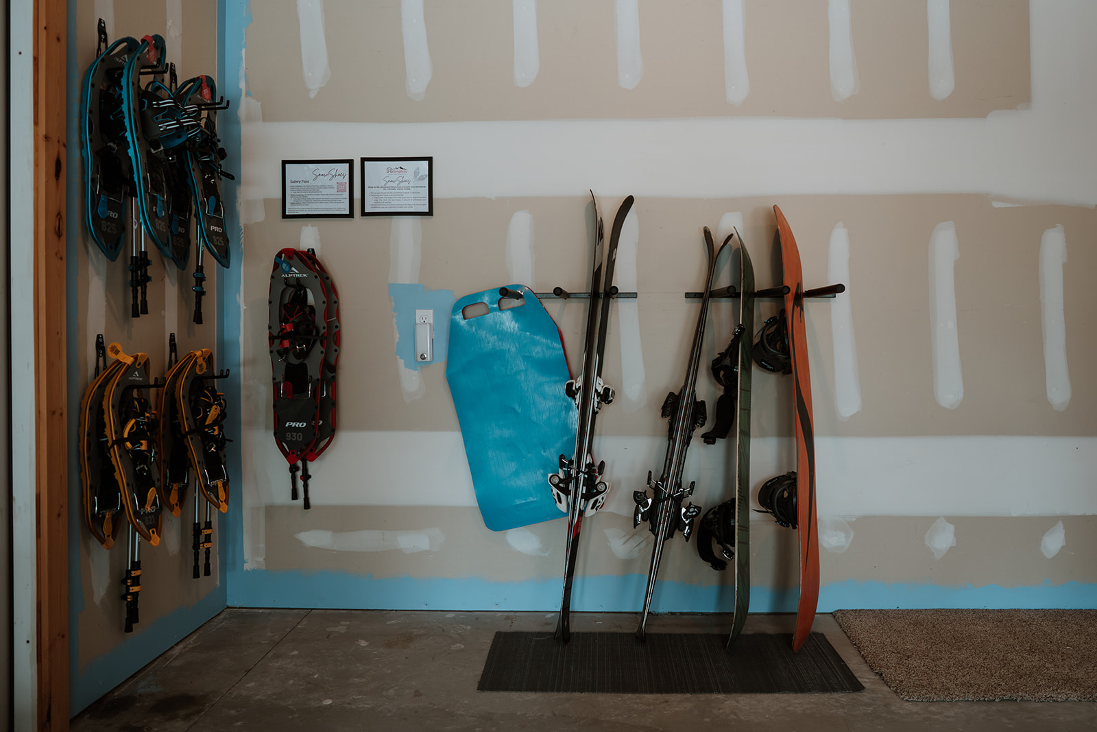 Enter through a smart lock to our two-car heated garage, with dedicated ski and snowboard storage. We provide snowshoes for your adventure, but cannot guarantee fit for all sizes. Bring your own boots. Enter the mudroom to find boot warmers and ample space for your gear.