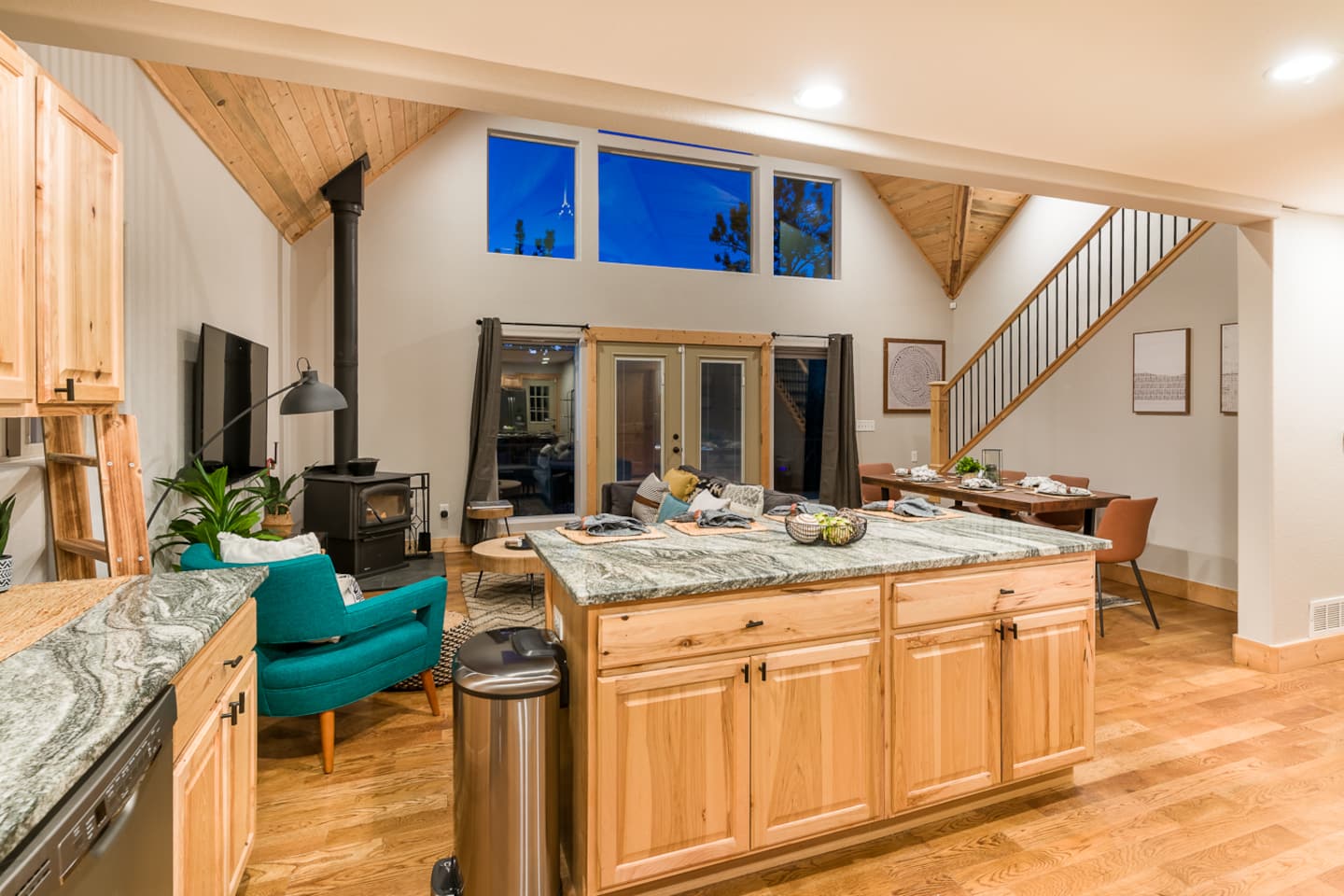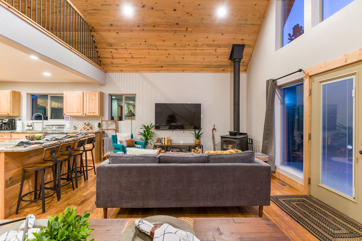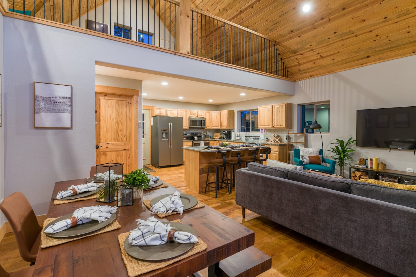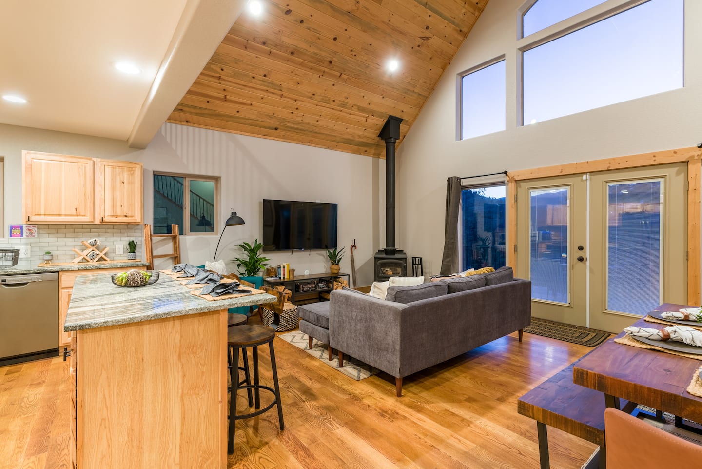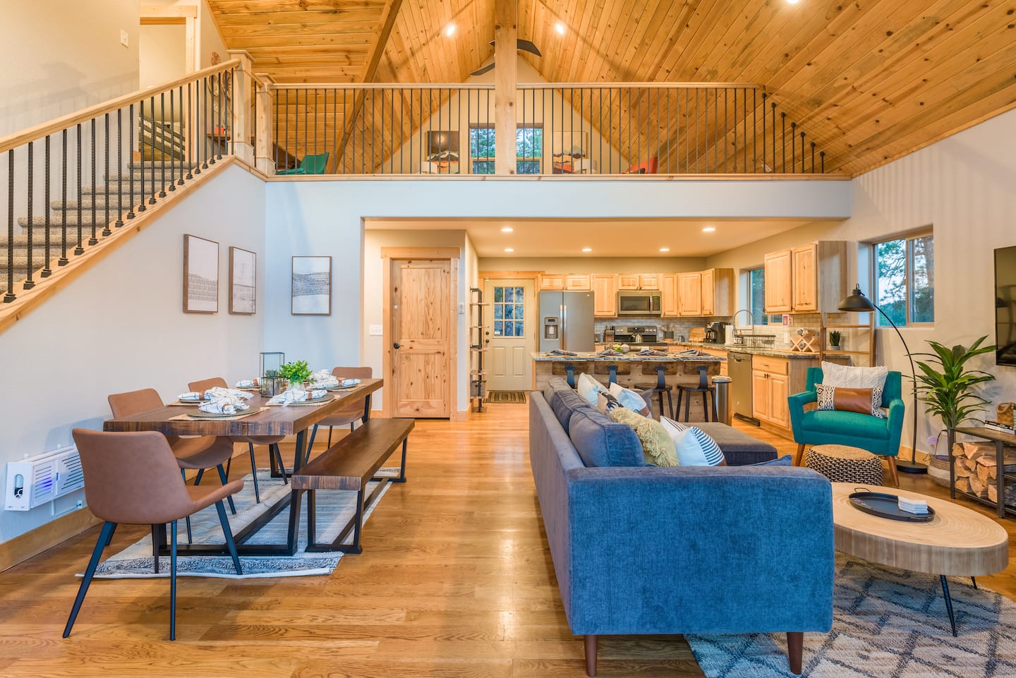 The main level blends handcrafted woodwork with open comfort. Vaulted ceilings and bay windows frame the view, while a wood-burning fireplace and freestanding stove create a warm gathering spot. A 65” Smart TV offers entertainment, and the dining table seats six with extra space at the granite-topped kitchen island. The kitchen is fully equipped with stainless steel appliances, stone counters, cookware, and essentials for meals together. Upstairs, the loft doubles as a versatile area for board games, reading, or setting up at the dedicated workspace. The converted garage serves as a game room with foosball, basketball, and an extra fridge.