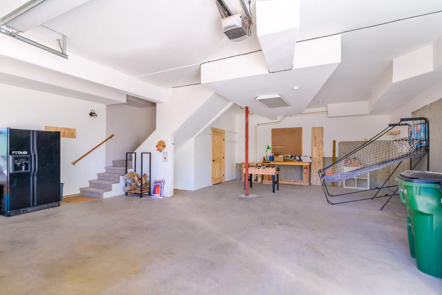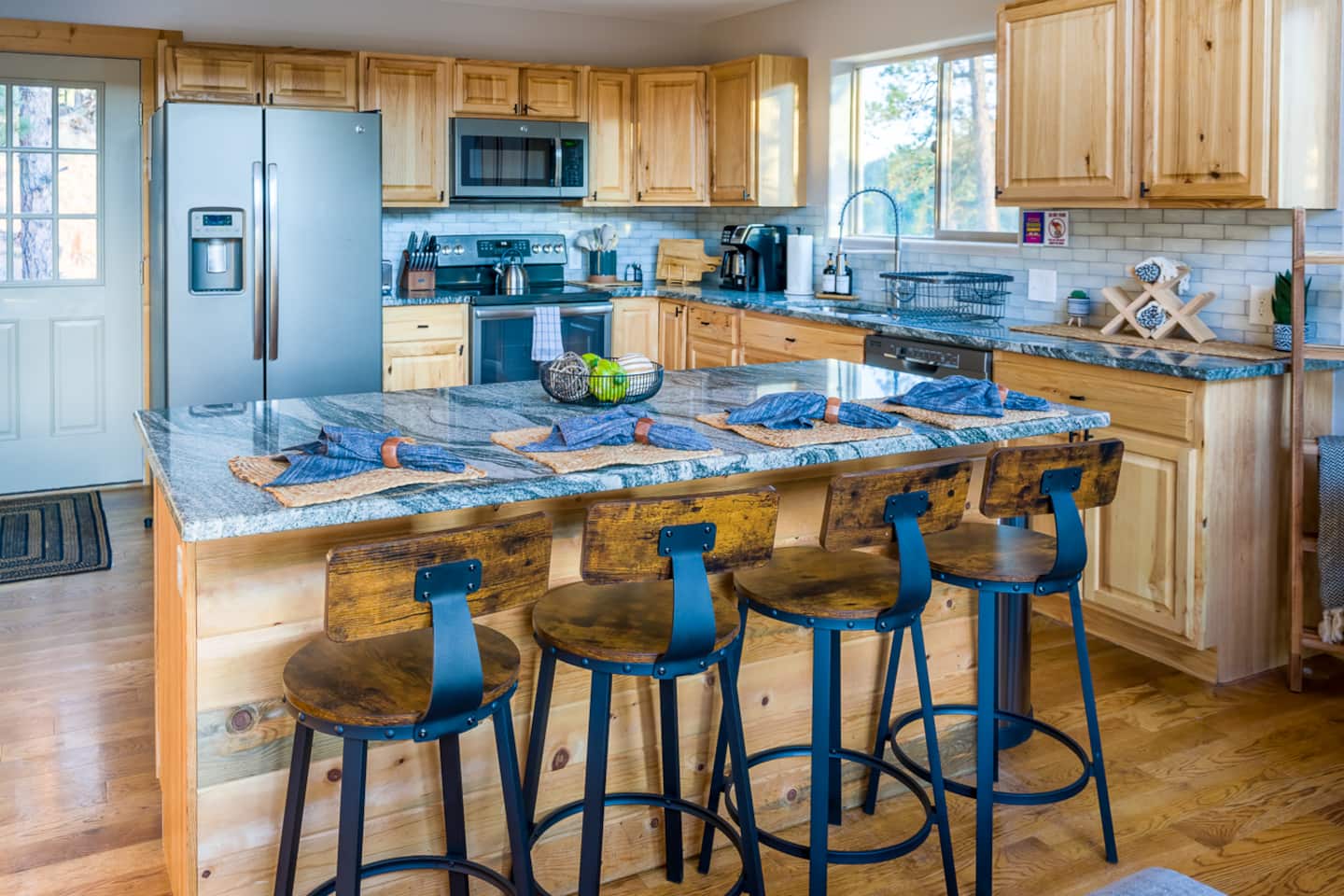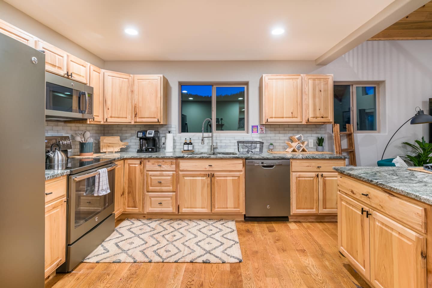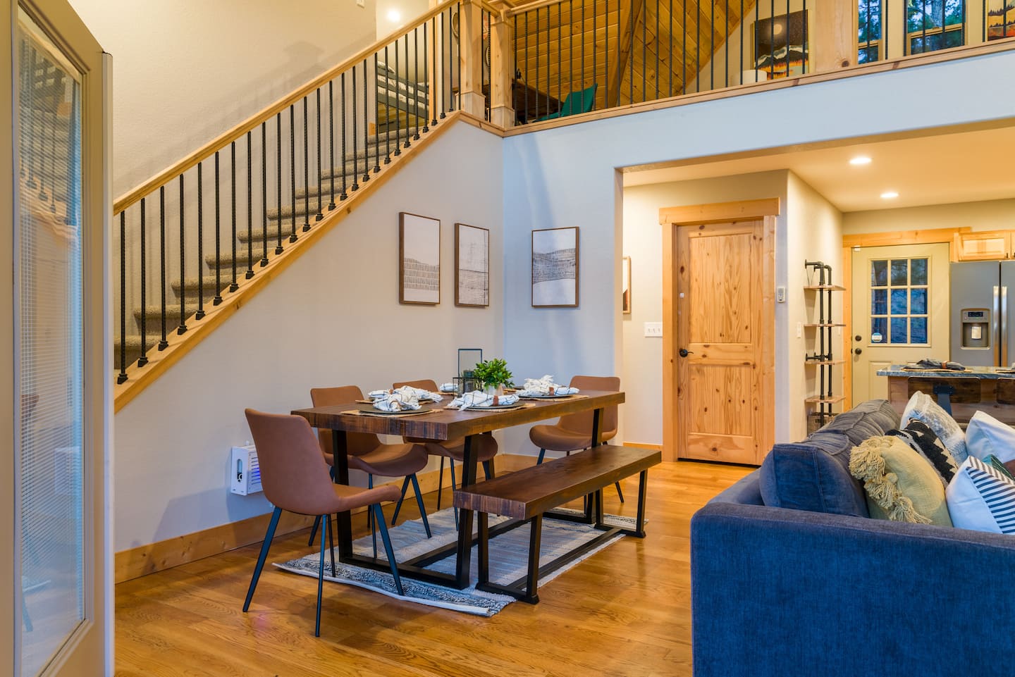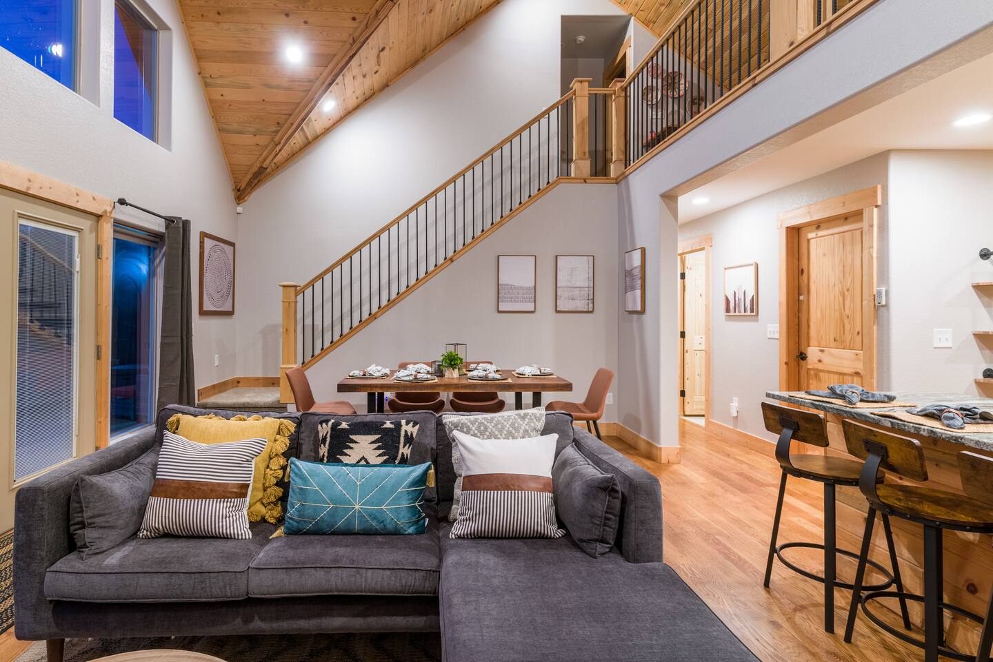 The main level blends handcrafted woodwork with open comfort. Vaulted ceilings and bay windows frame the view, while a wood-burning fireplace and freestanding stove create a warm gathering spot. A 65” Smart TV offers entertainment, and the dining table seats six with extra space at the granite-topped kitchen island. The kitchen is fully equipped with stainless steel appliances, stone counters, cookware, and essentials for meals together. Upstairs, the loft doubles as a versatile area for board games, reading, or setting up at the dedicated workspace. The converted garage serves as a game room with foosball, basketball, and an extra fridge.
