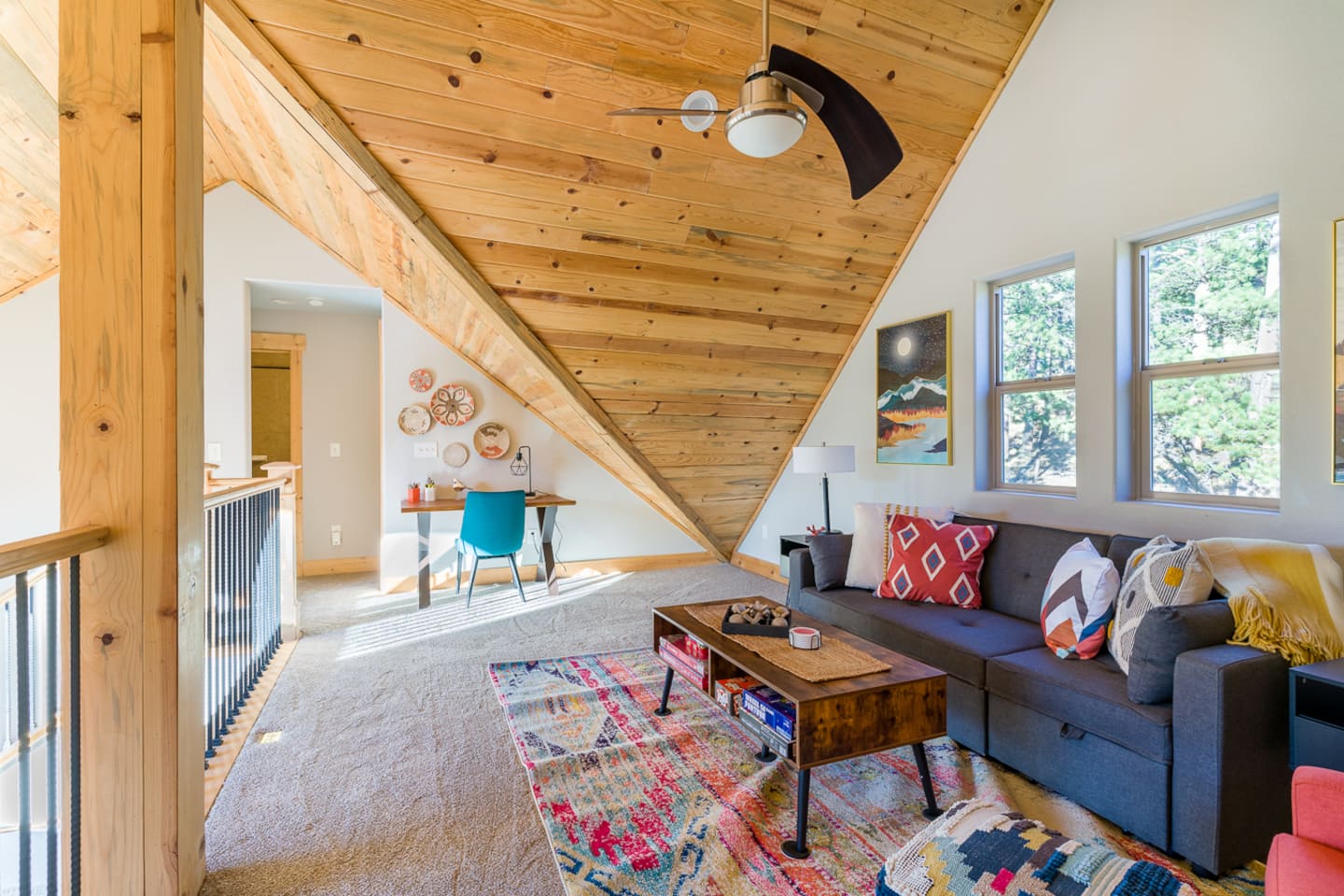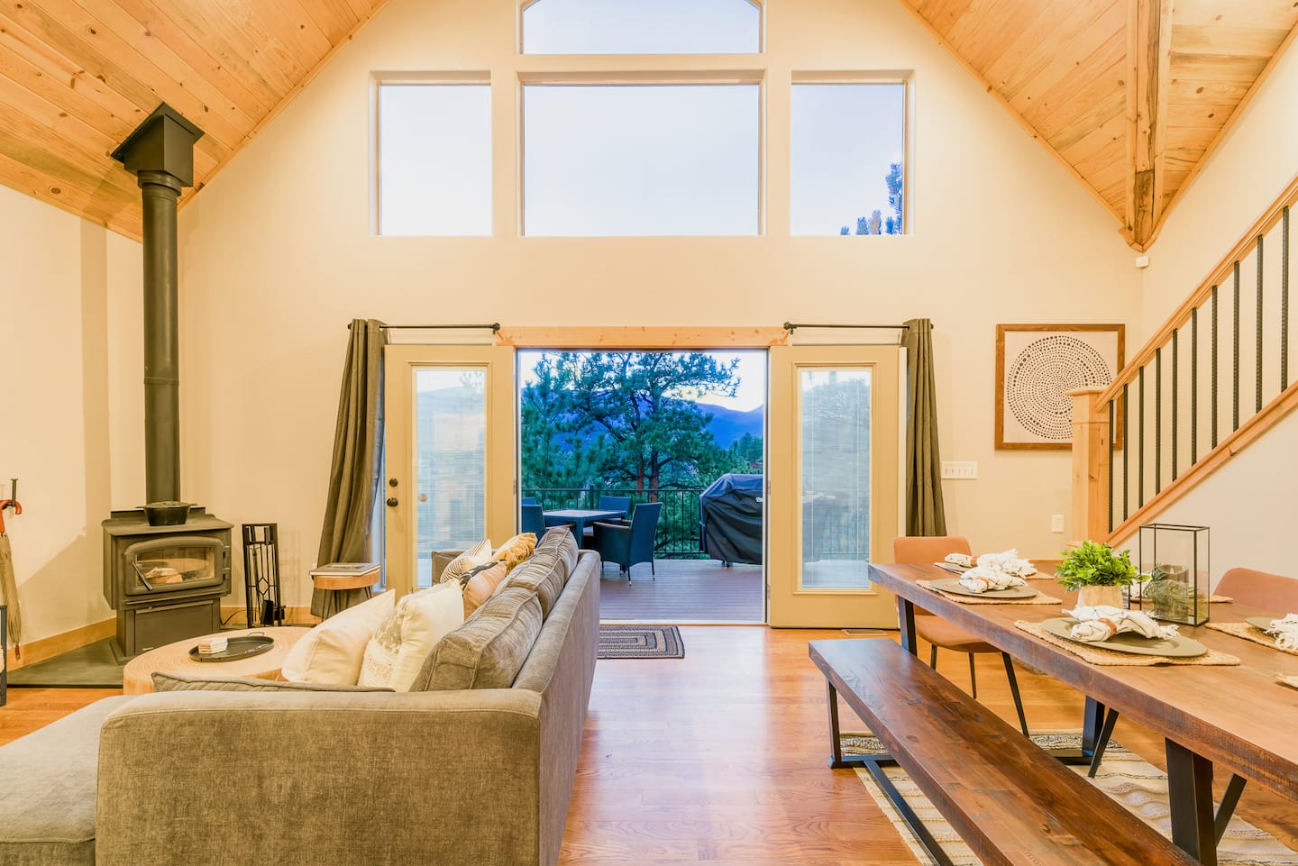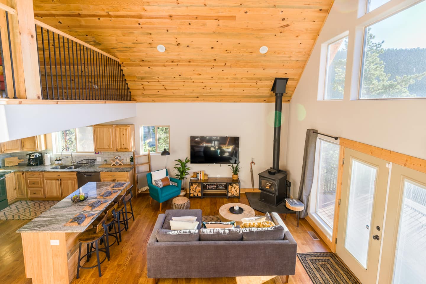 The cabin sits in a quiet mountain community just 15 minutes from downtown Bailey, where you’ll find local dining, cafés, and breweries. Hiking, fishing, biking, and ATV trails are close by, with Staunton State Park, Red Rocks Amphitheatre, and Breckenridge all within a drive.