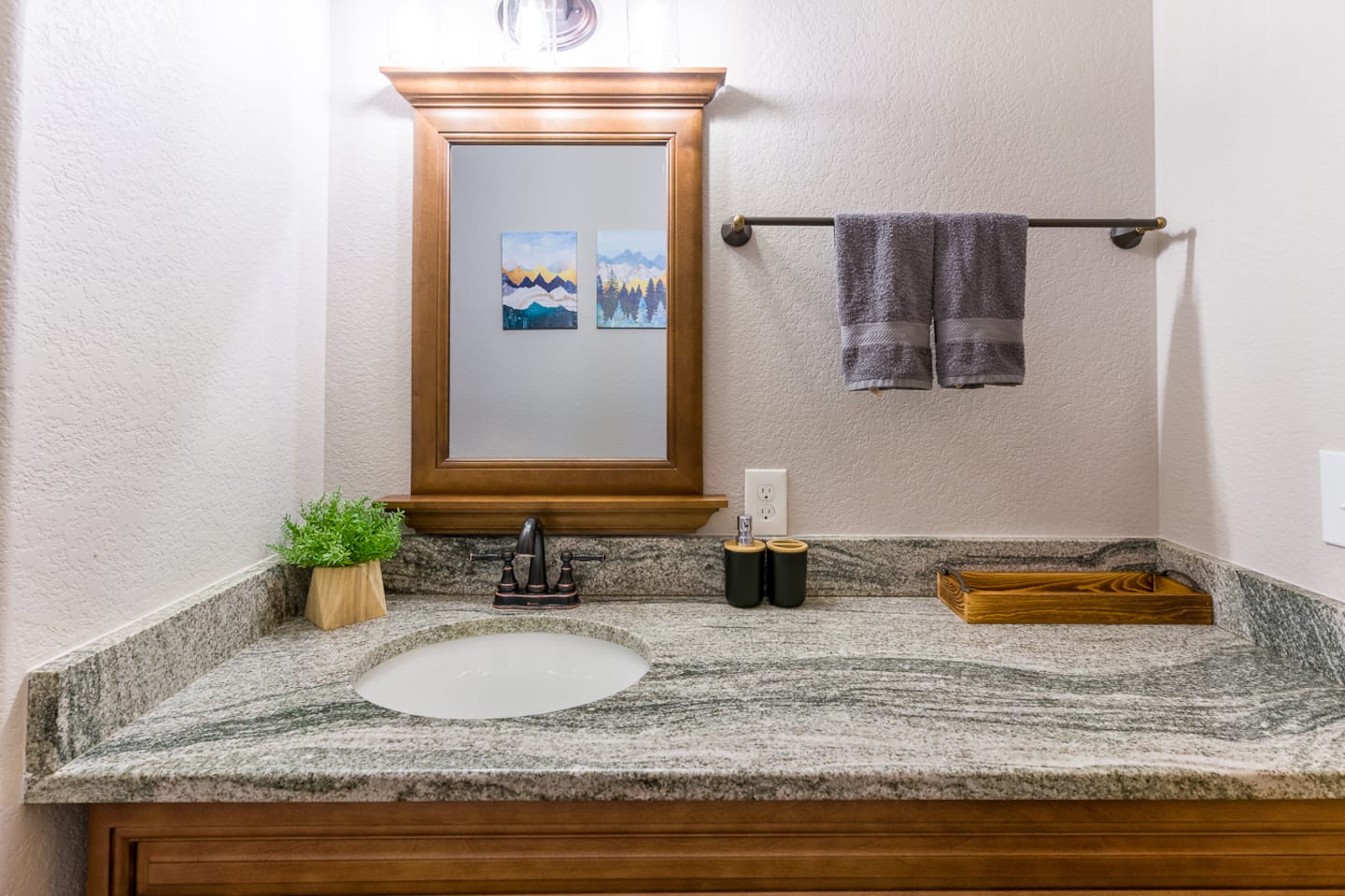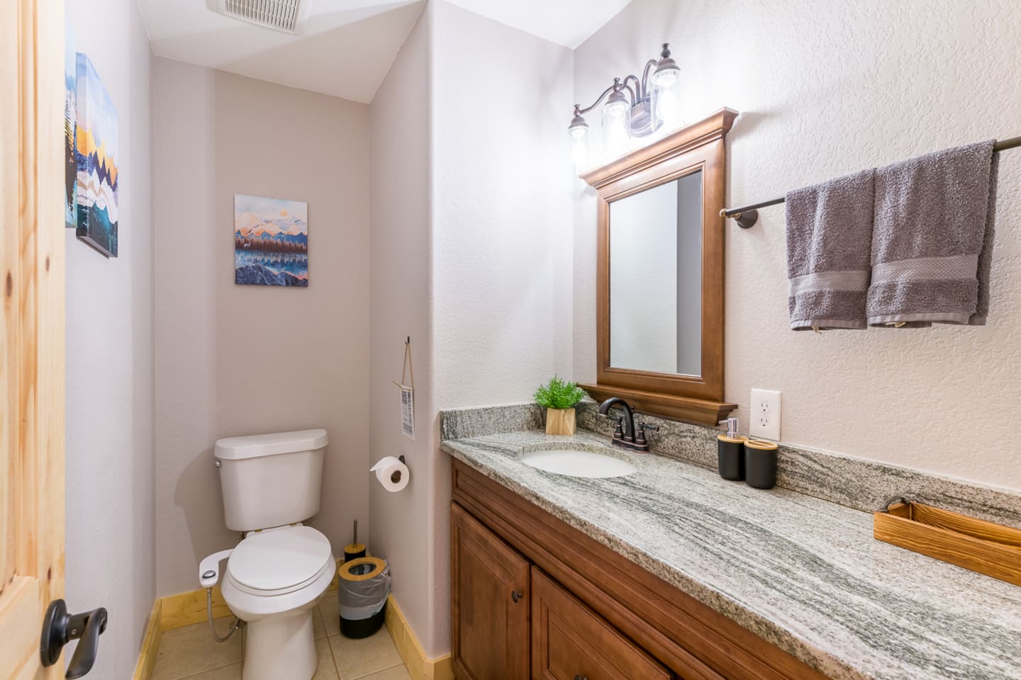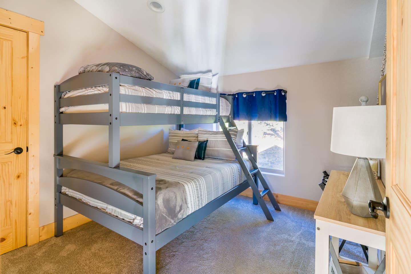 Three bedrooms and a loft provide restful spaces after days outdoors. On the main level, the primary suite has a king bed, 45” Smart TV, and French doors opening to the patio. Its ensuite bathroom includes a shower/tub combo and dual vanities. Upstairs, one bedroom holds a queen bed with serene views, while another features a twin-over-queen bunk suited for families or friends. A sofa sleeper in the loft offers additional space.