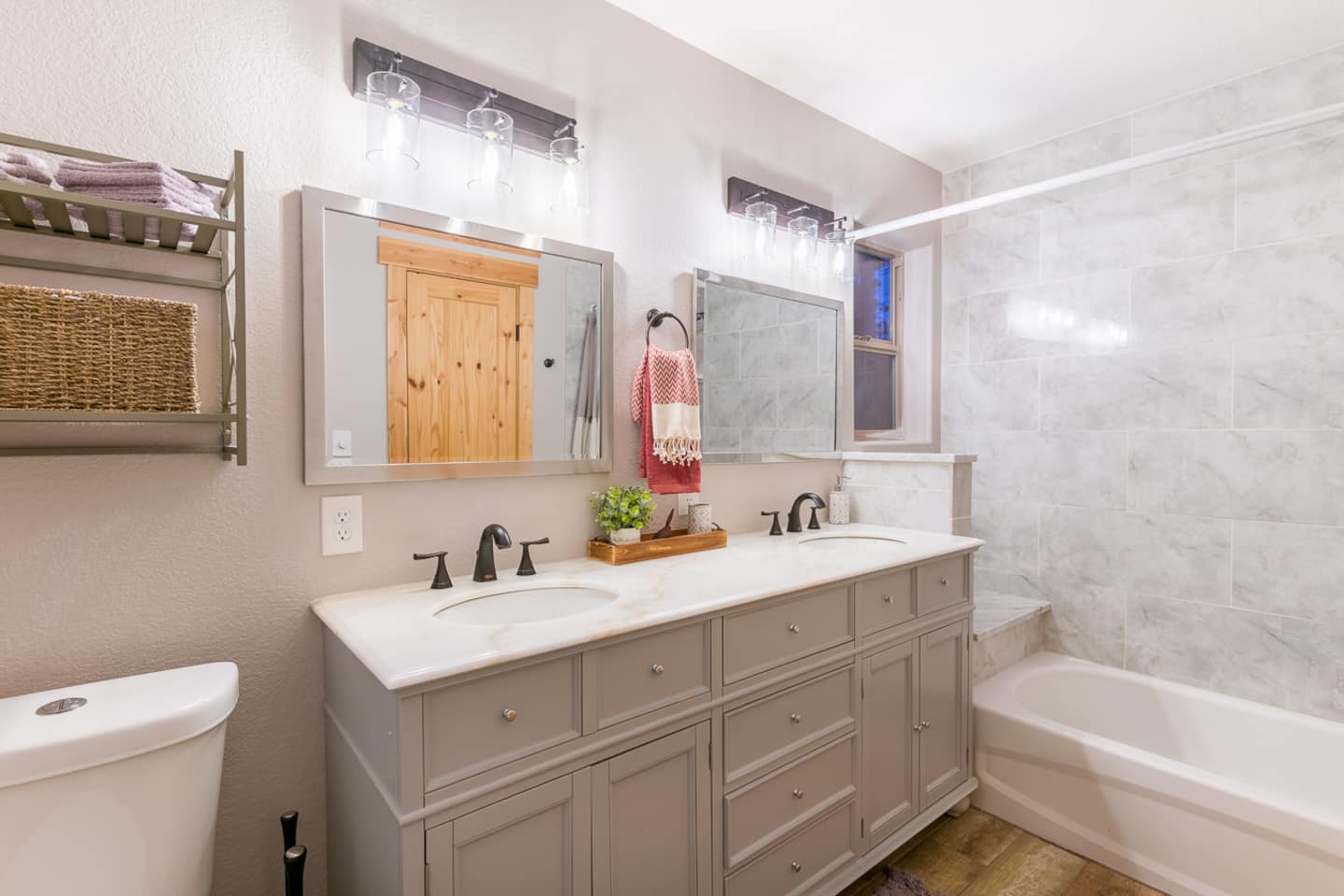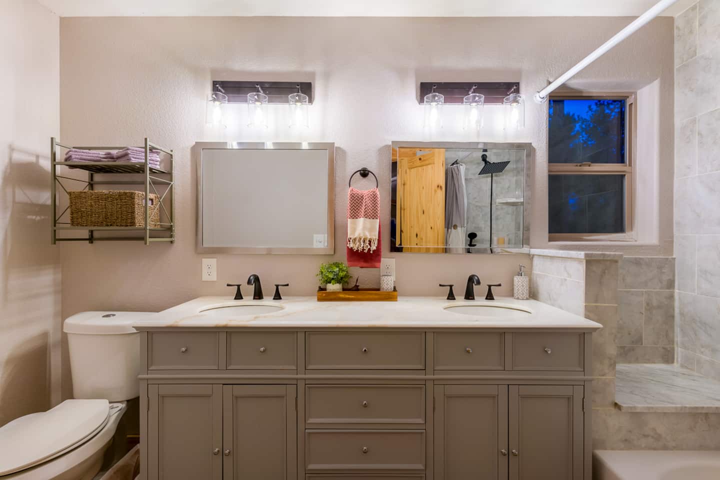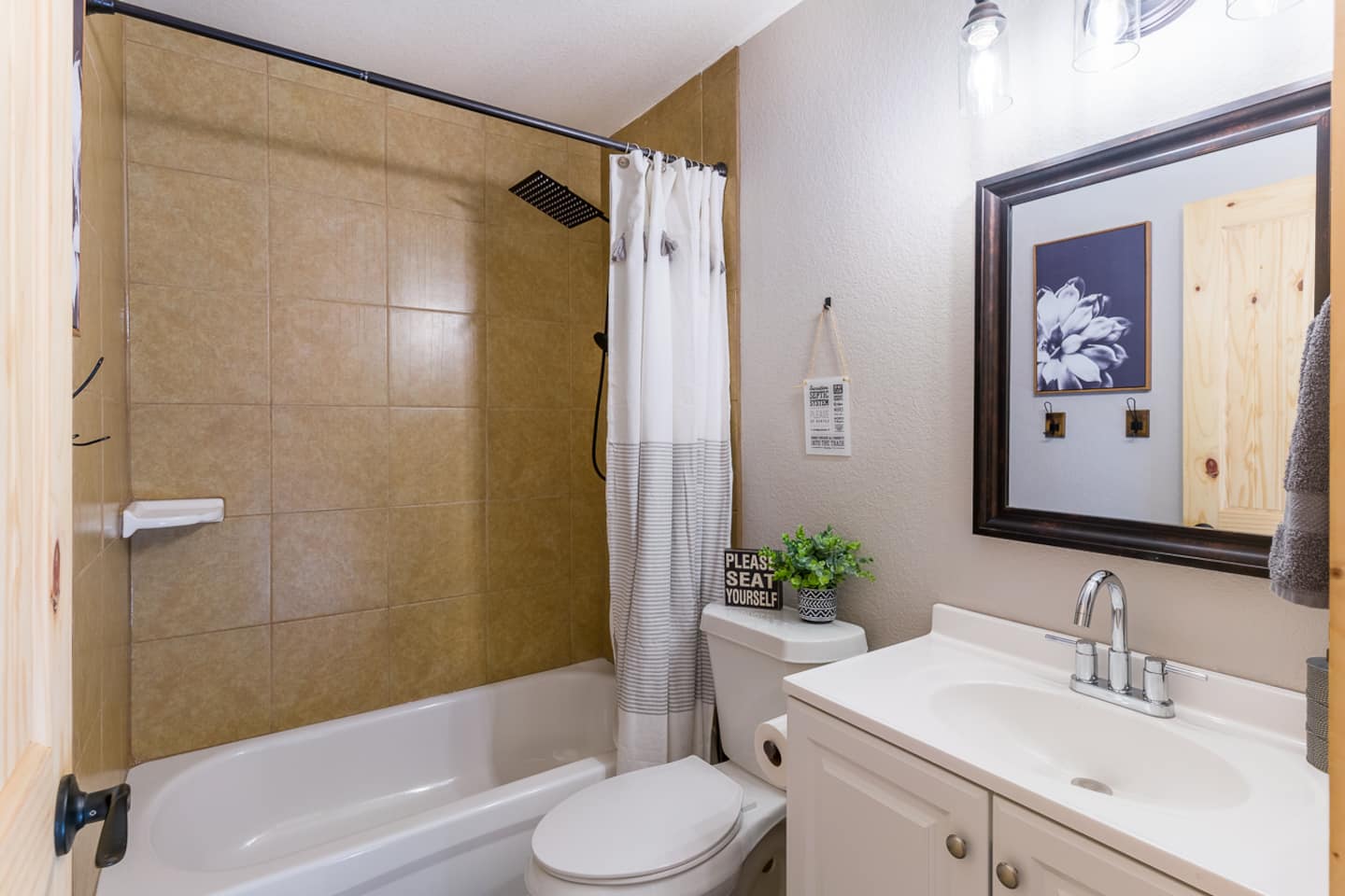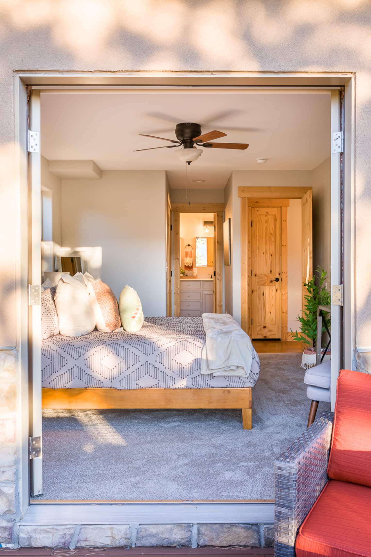 Three bedrooms and a loft provide restful spaces after days outdoors. On the main level, the primary suite has a king bed, 45” Smart TV, and French doors opening to the patio. Its ensuite bathroom includes a shower/tub combo and dual vanities. Upstairs, one bedroom holds a queen bed with serene views, while another features a twin-over-queen bunk suited for families or friends. A sofa sleeper in the loft offers additional space.