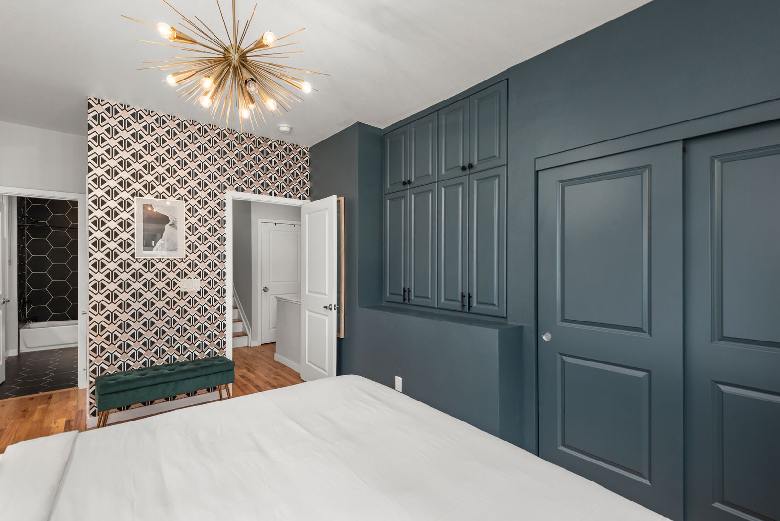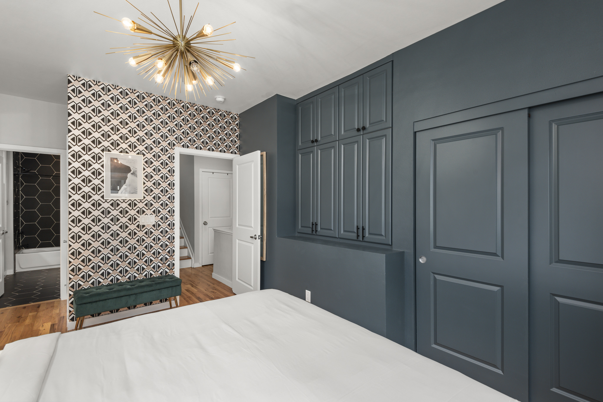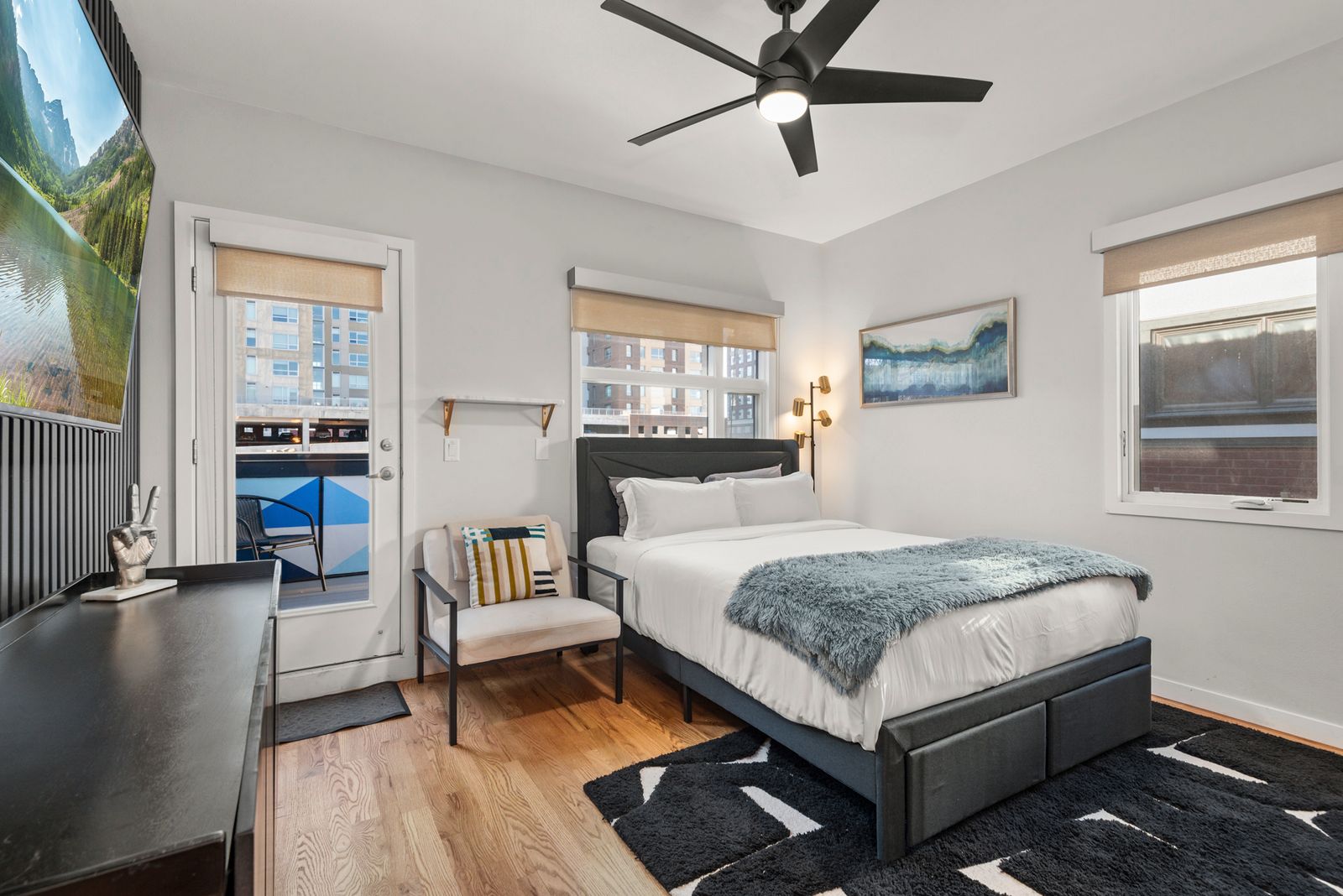 ✔ Bedroom 2: Queen bed + TV'55 + private ensuite. Located on the top (3rd) floor with direct access to the rooftop patio. The room features a door to the terrace, while the entry remains open in a loft-style layout.