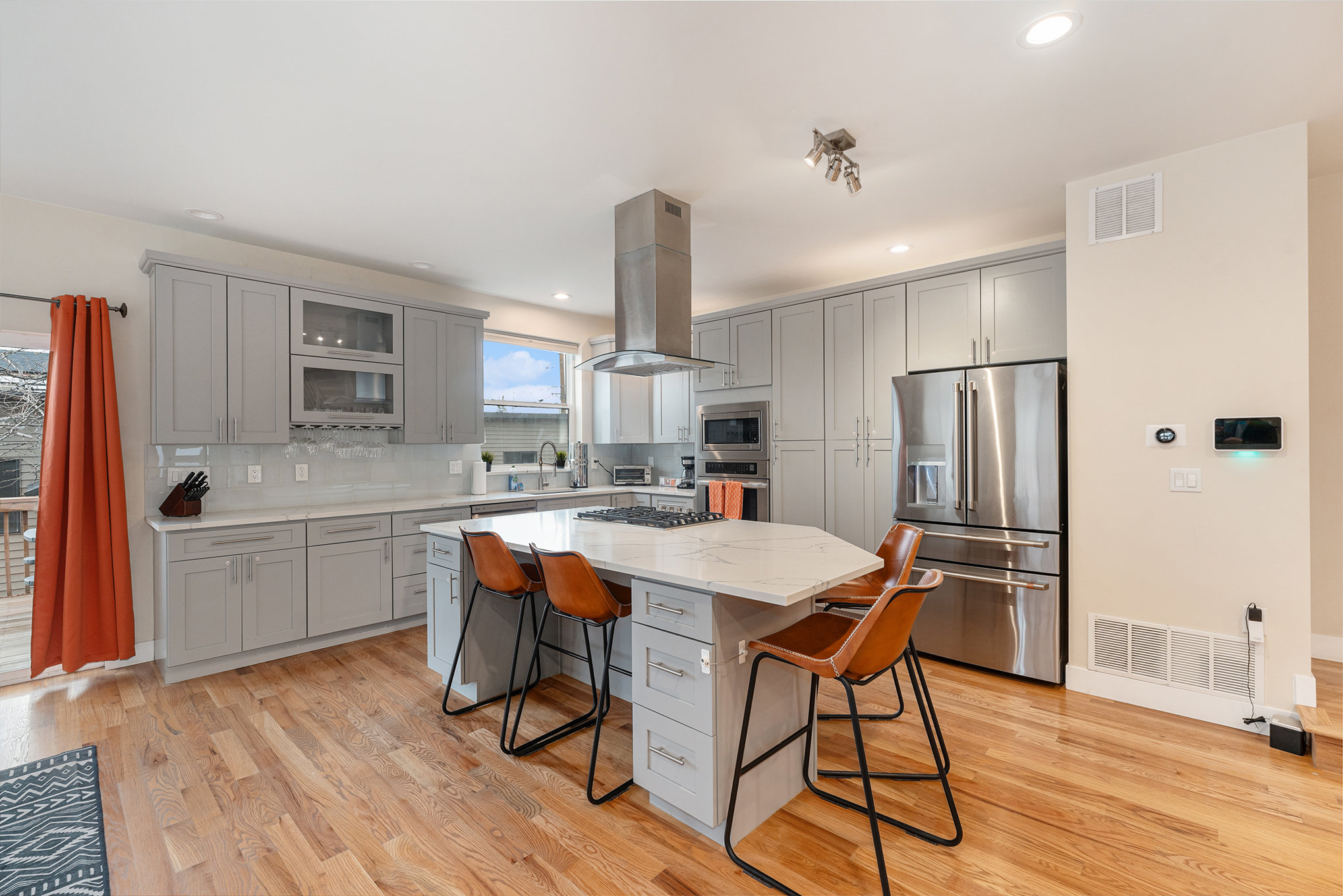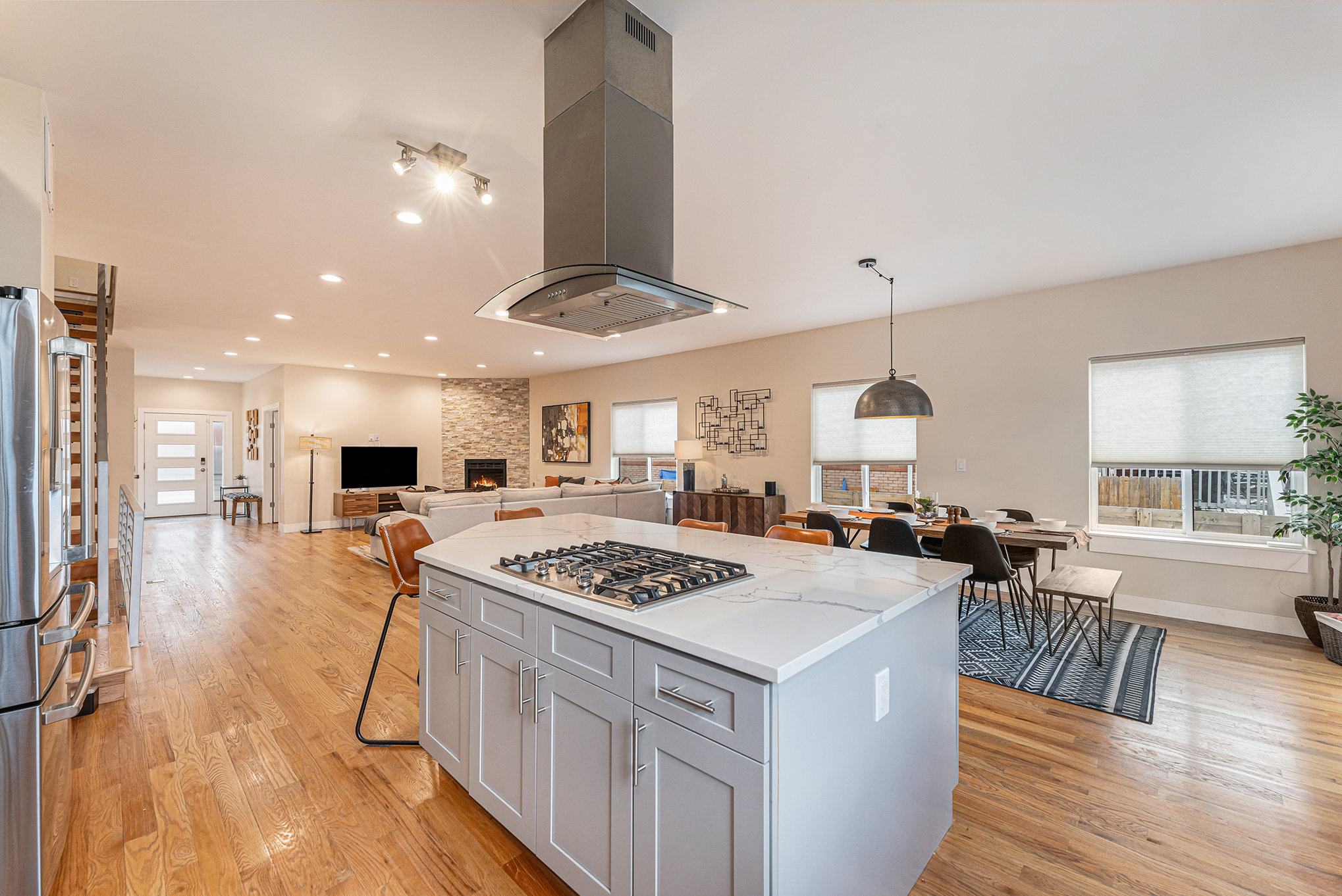 Connect and recharge in this stunning home featuring 4,000 sq. ft. of spacious comfort with elegant interiors, two master suites, a rooftop patio with firepit, sauna, HOT TUB, 2-car garage, kids room, gym equipment, fully fenced yard, office, fireplace, gourmet kitchen, and more!