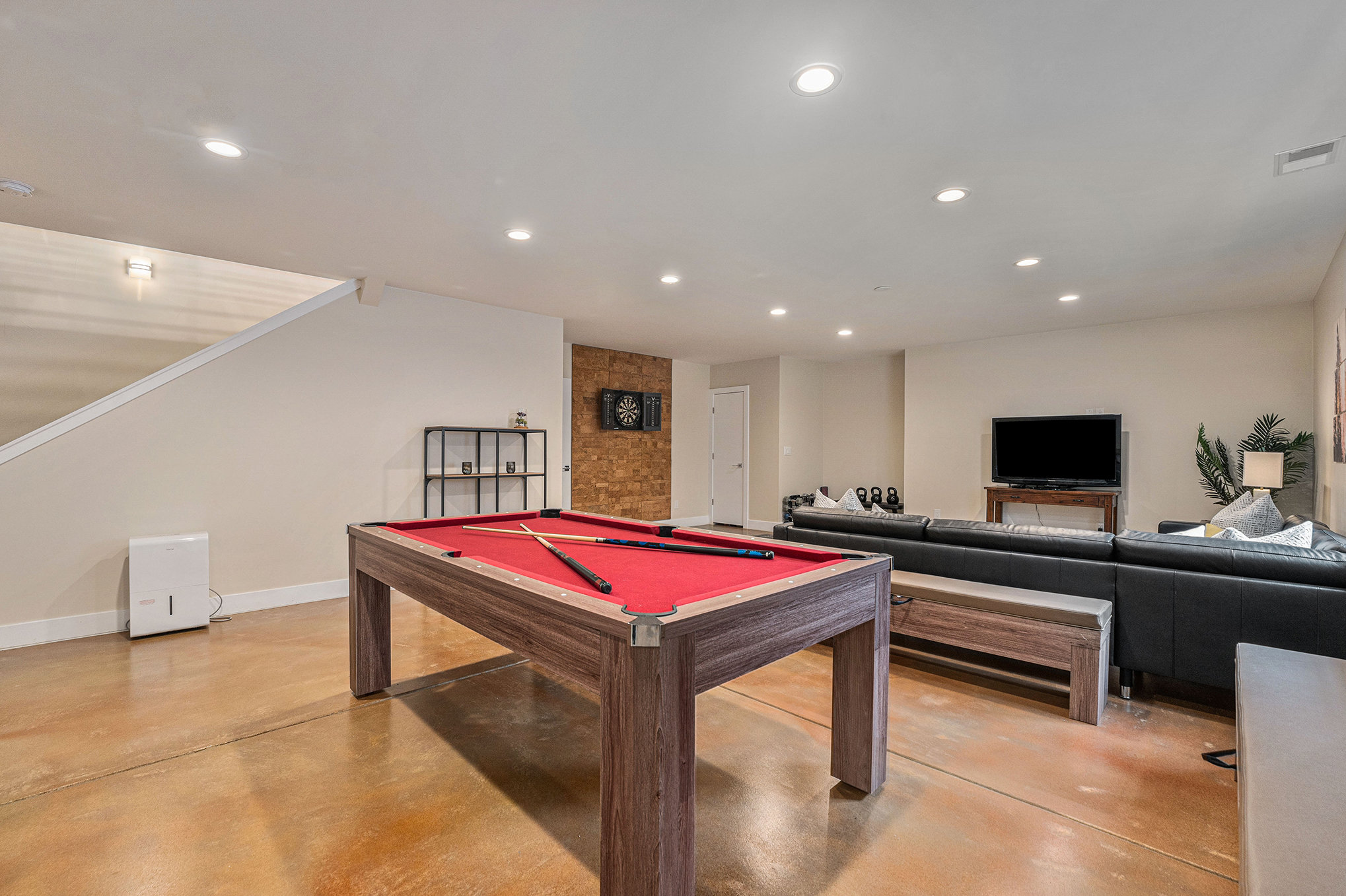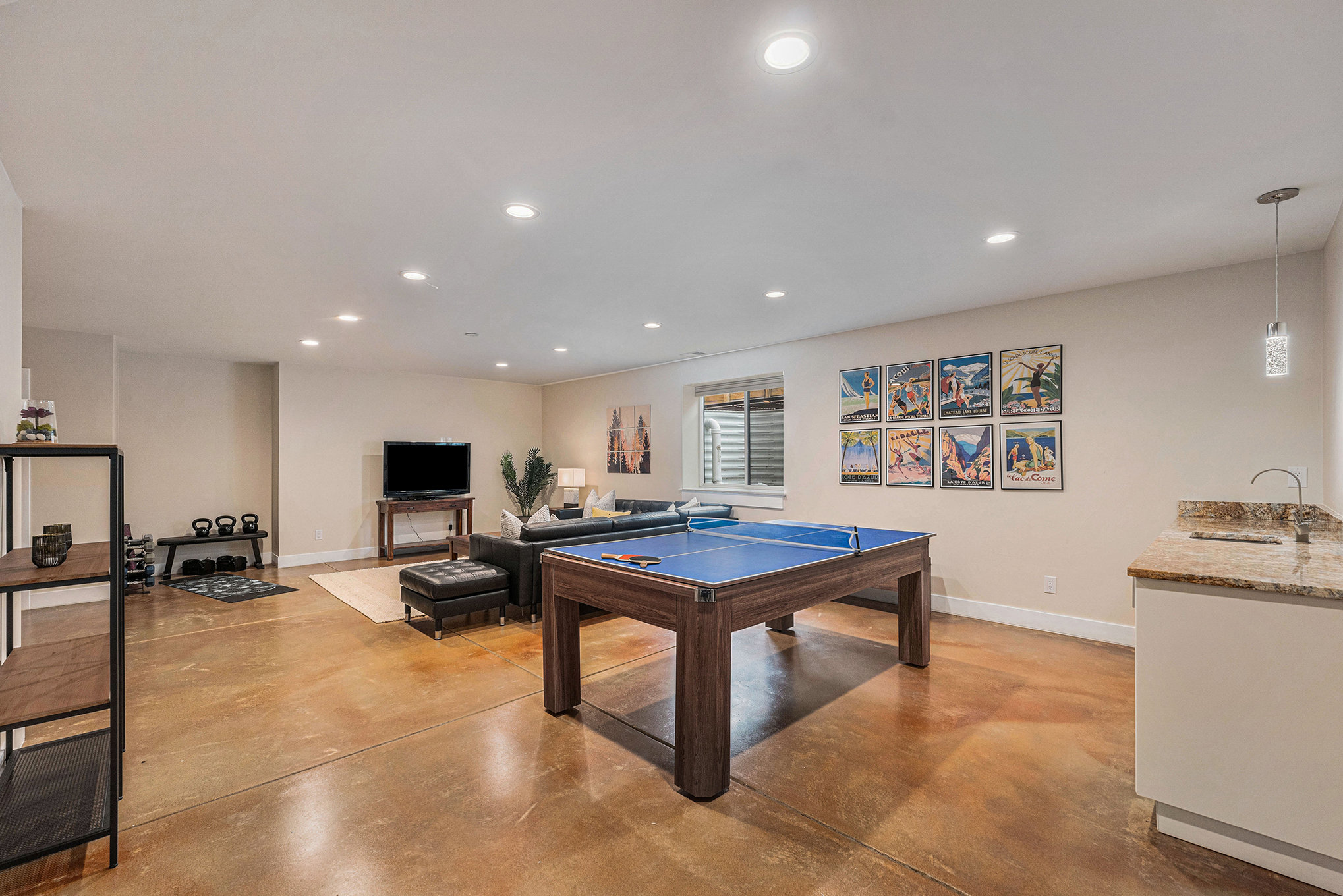 Cozy up with your friends and family and watch a movie on the sofa. Challenge your friends to a game of pool, ping-pong, or darts. Chill your bottle of wine in the wine fridge. Stay active with our gym equipment: kettlebells, dumbbells, bench, and yoga mats.