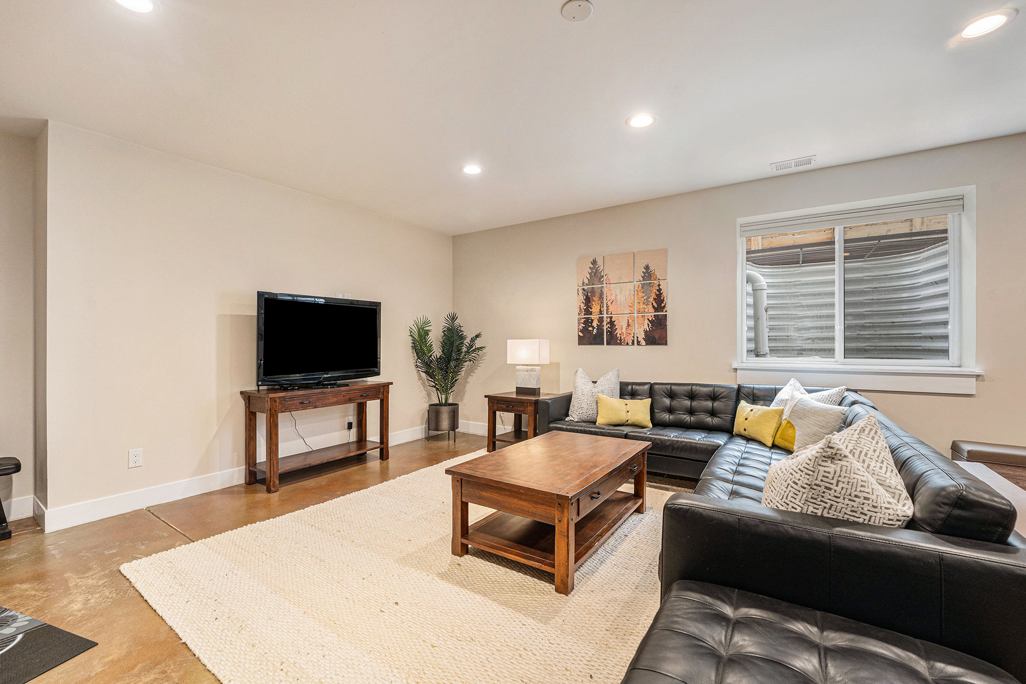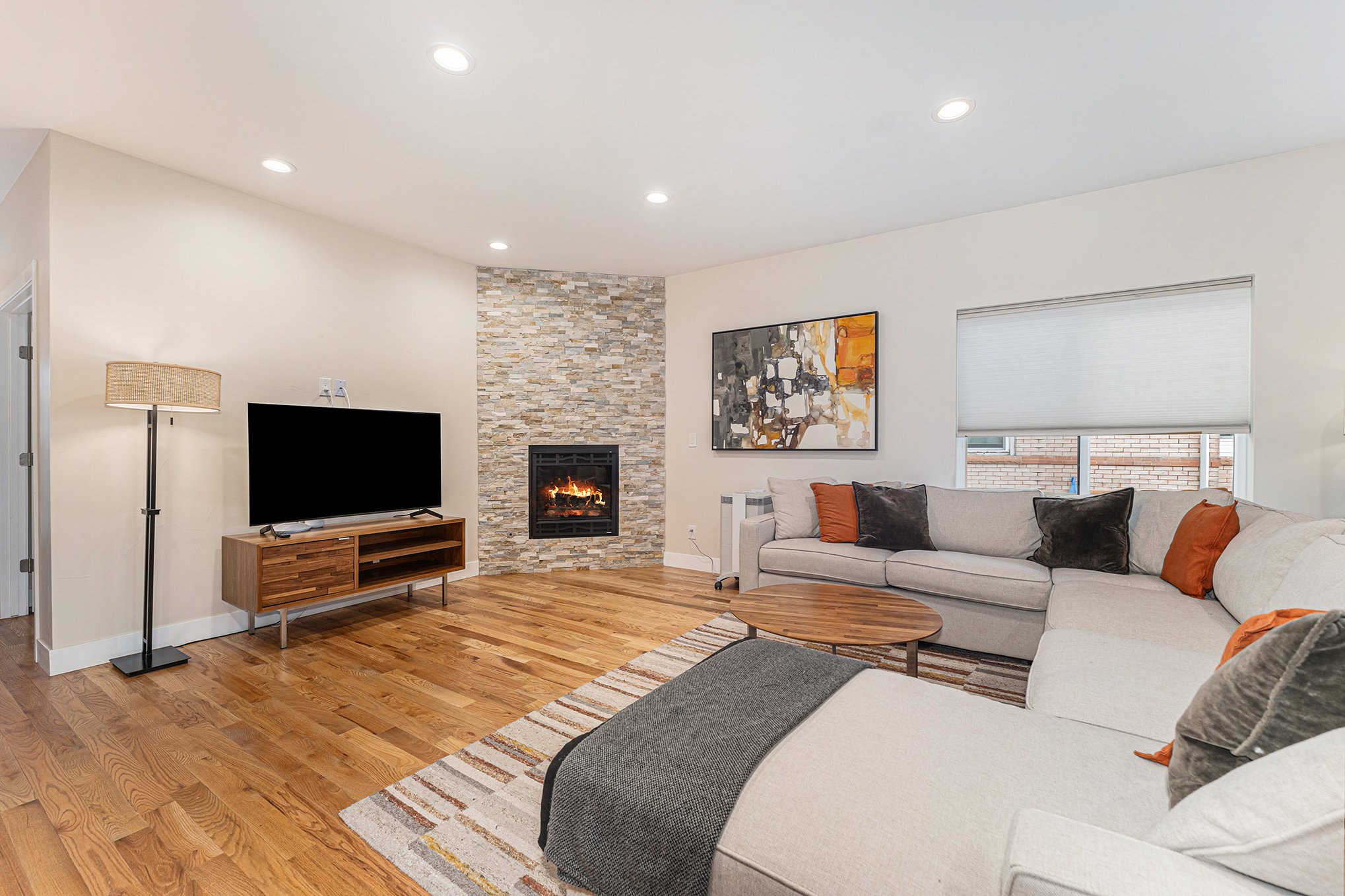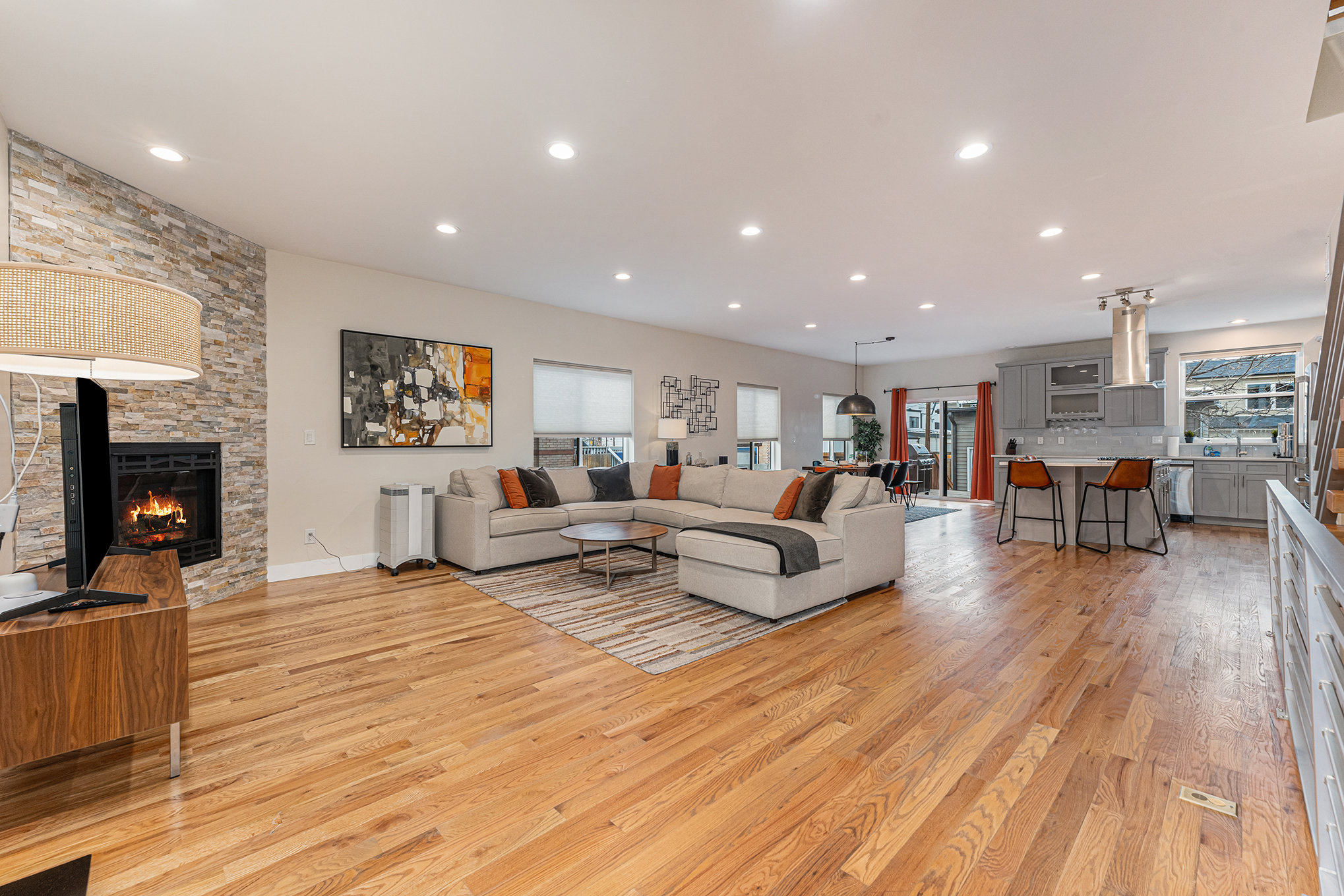 This bright and spacious, open-concept living room provides plenty of space to relax & unwind in style. Perfect for large groups who want a central place to eat, chat, watch TV and just chill. Enjoy movies in front of the gas fireplace on the comfy sectional + Smart TV.