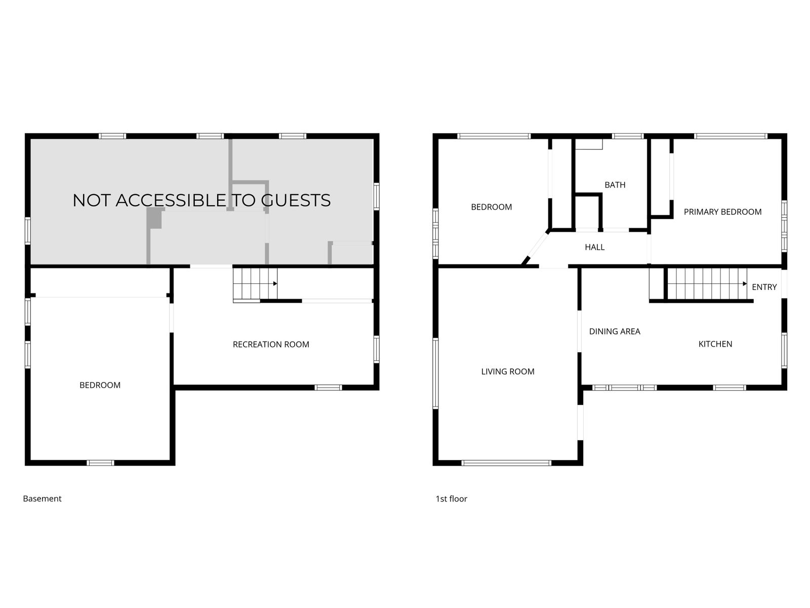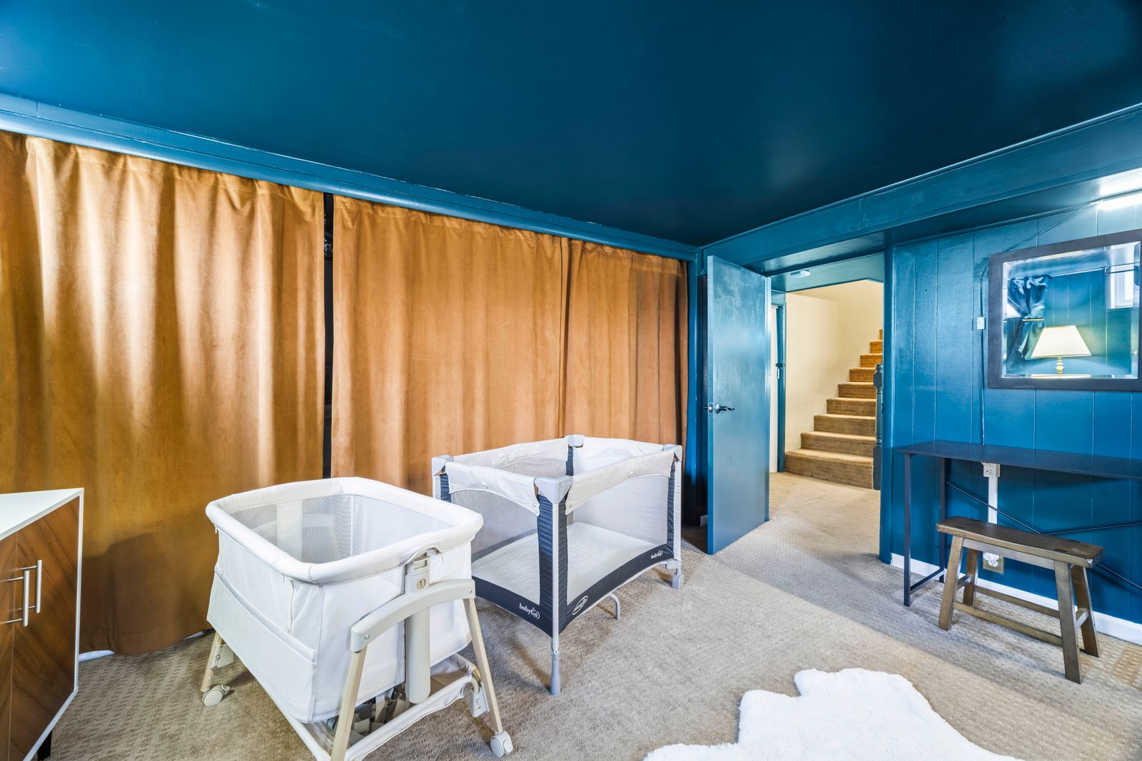 The living room invites you to kick back in style, featuring a comfortable couch, a hanging chair, and a large TV for entertainment. Gather at the dining table, perfect for shared meals, board games, or catching up after a day of adventure. Please note: the basement space has low ceilings.