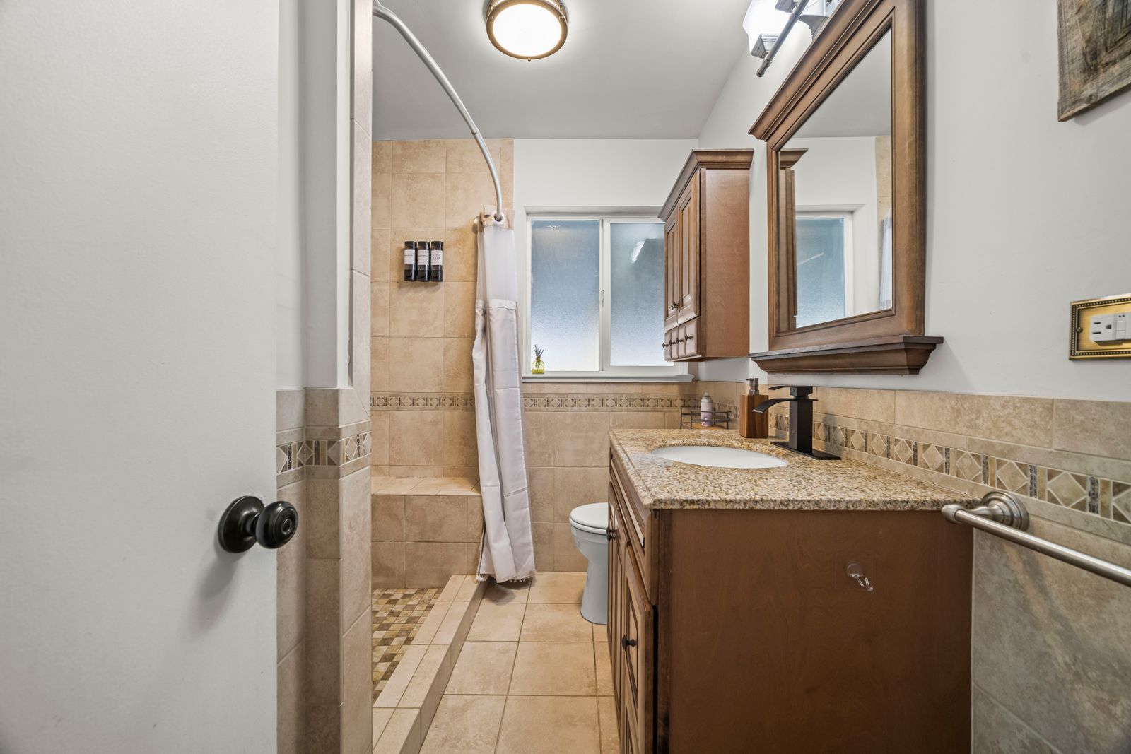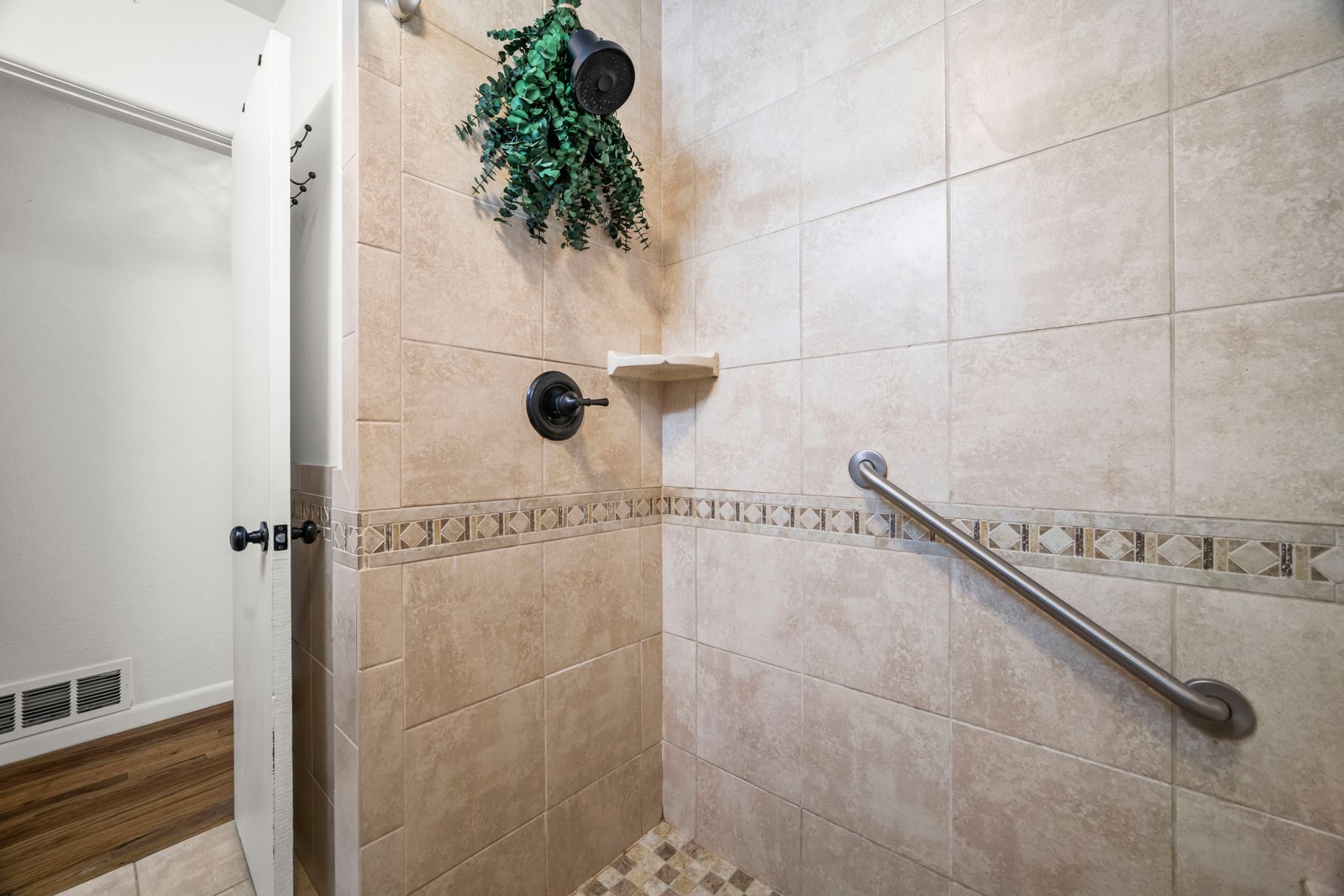 The bathroom offers a walk-in shower and grab bar, complemented by premium shampoo, conditioner, body wash, a hair dryer, and plush towels.