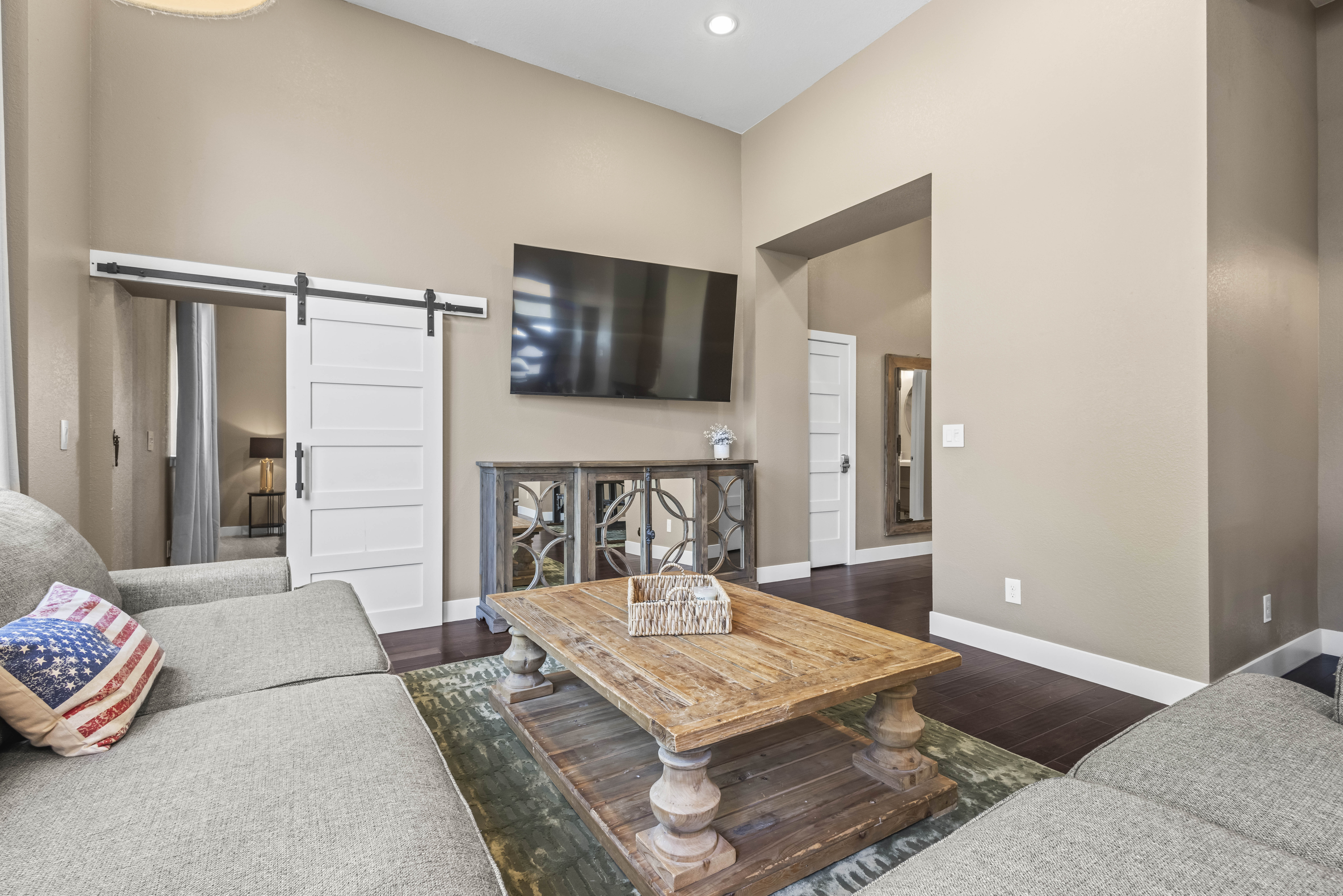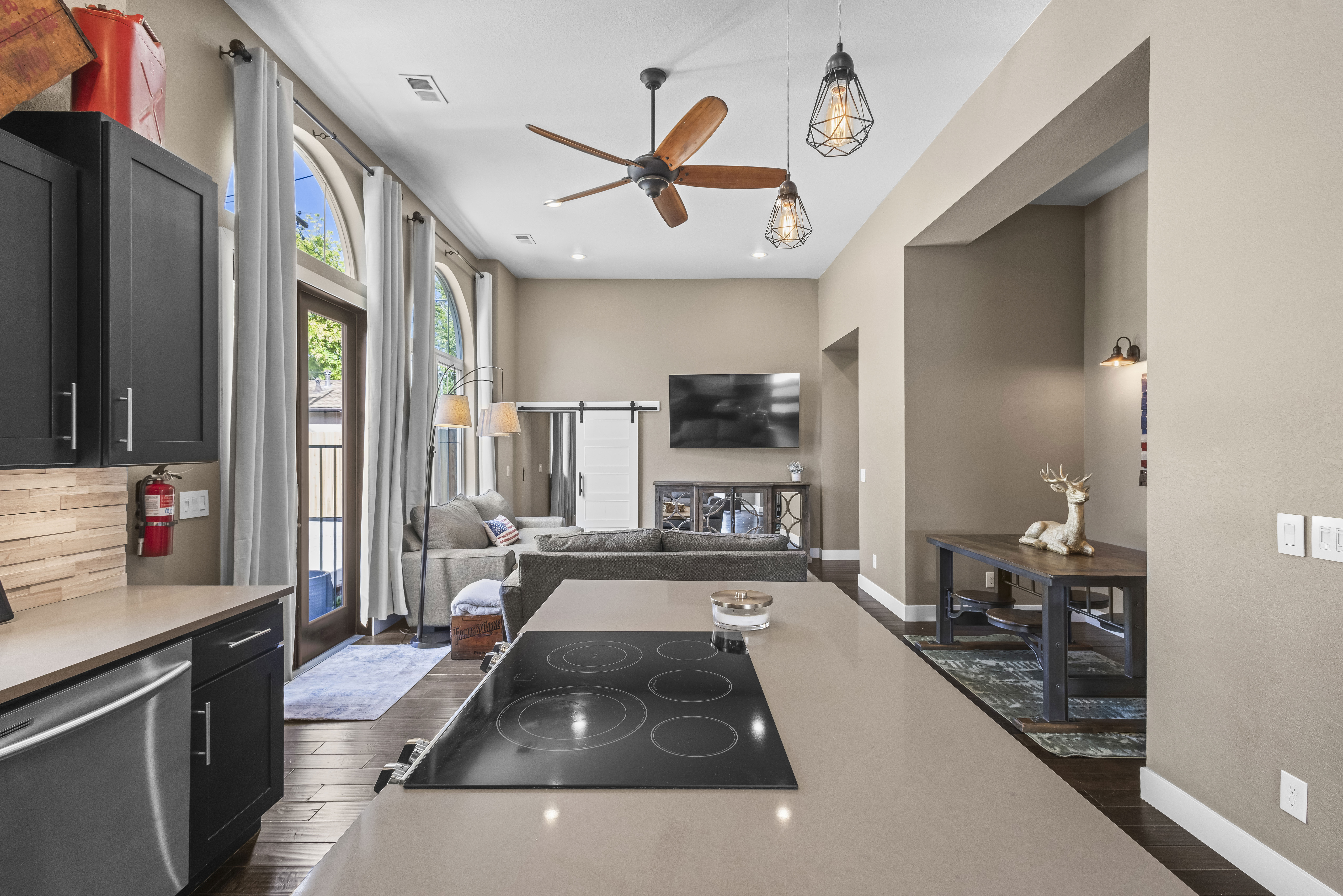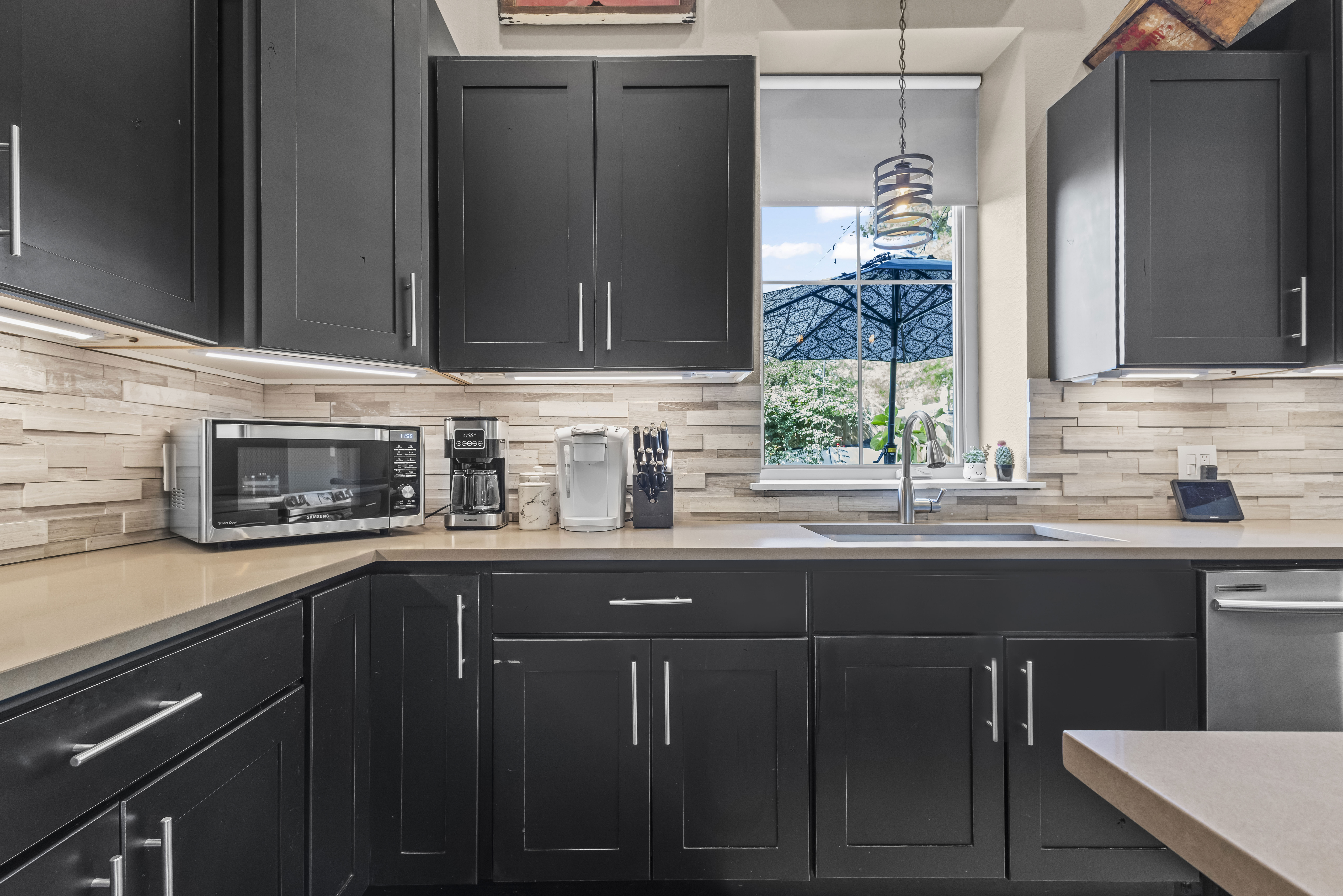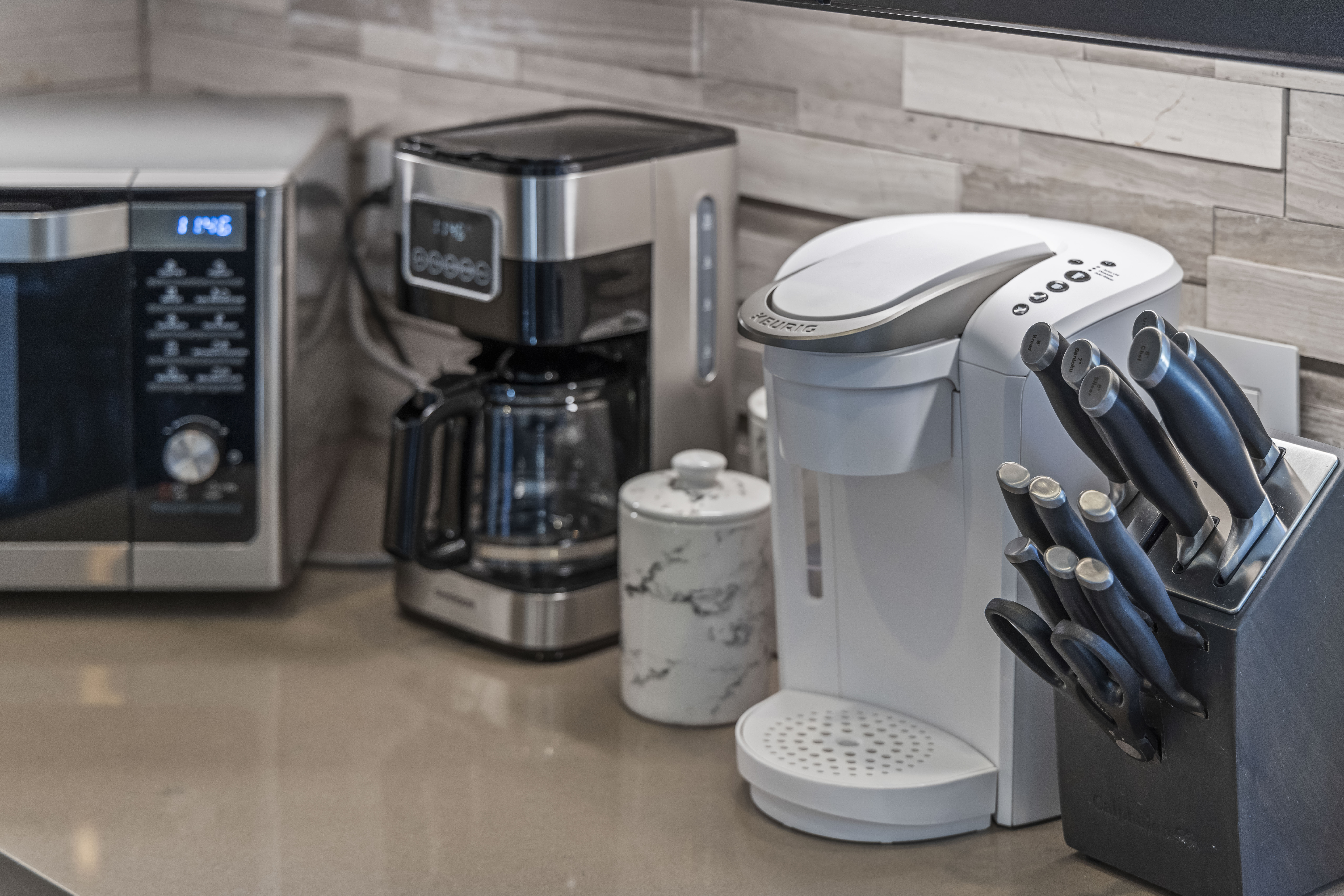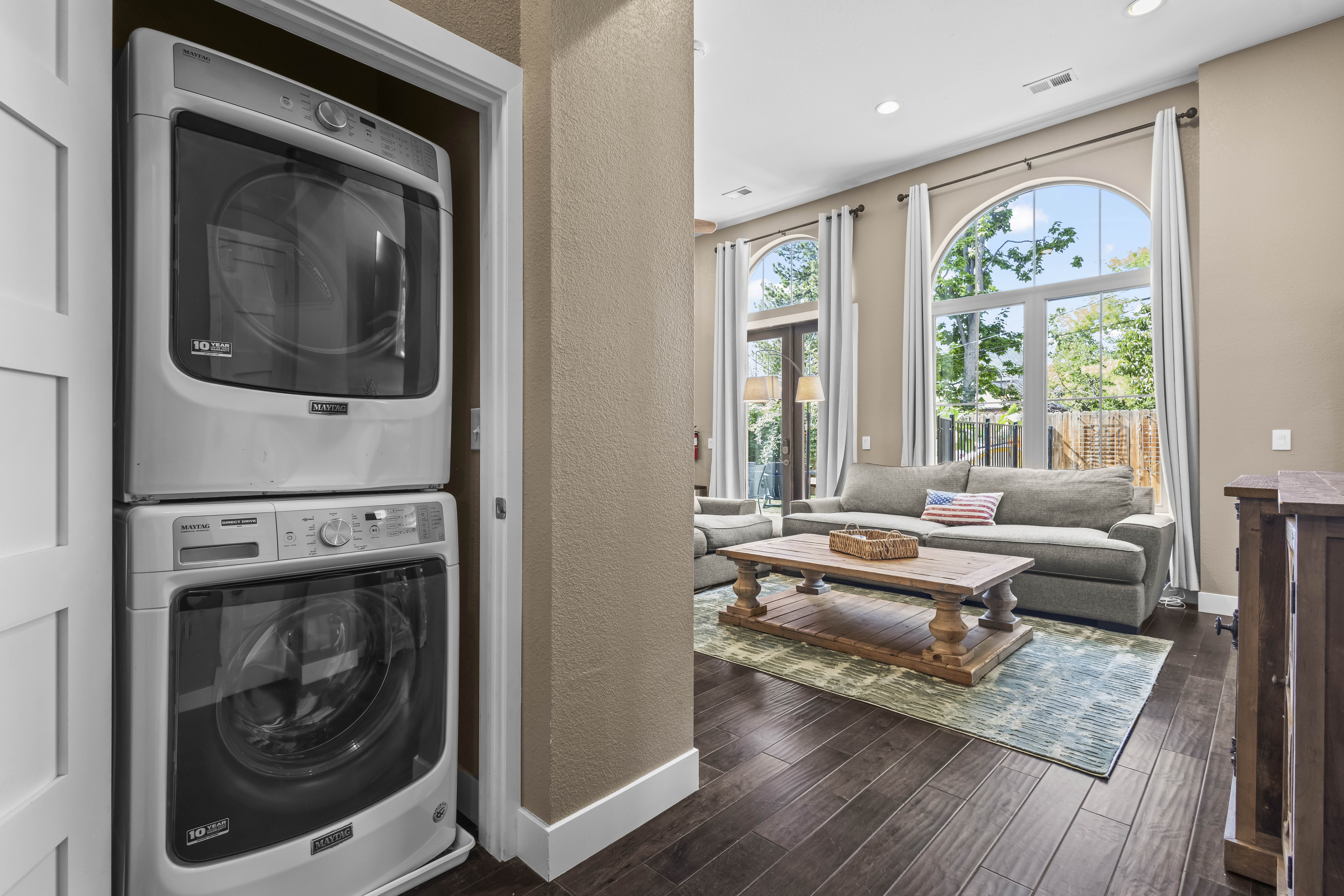 Enjoy the garden view from the living room’s big windows and cozy seating. The kitchen has everything you need—cookware, bakeware, and dishware—so meals are a breeze. Kickstart your morning with complimentary coffee from the drip machine, or pop in your own K-Cups with the Keurig. A washer and dryer are on hand to keep things convenient during your stay.