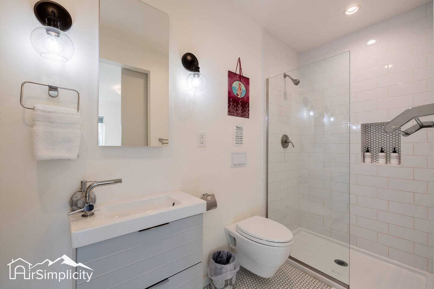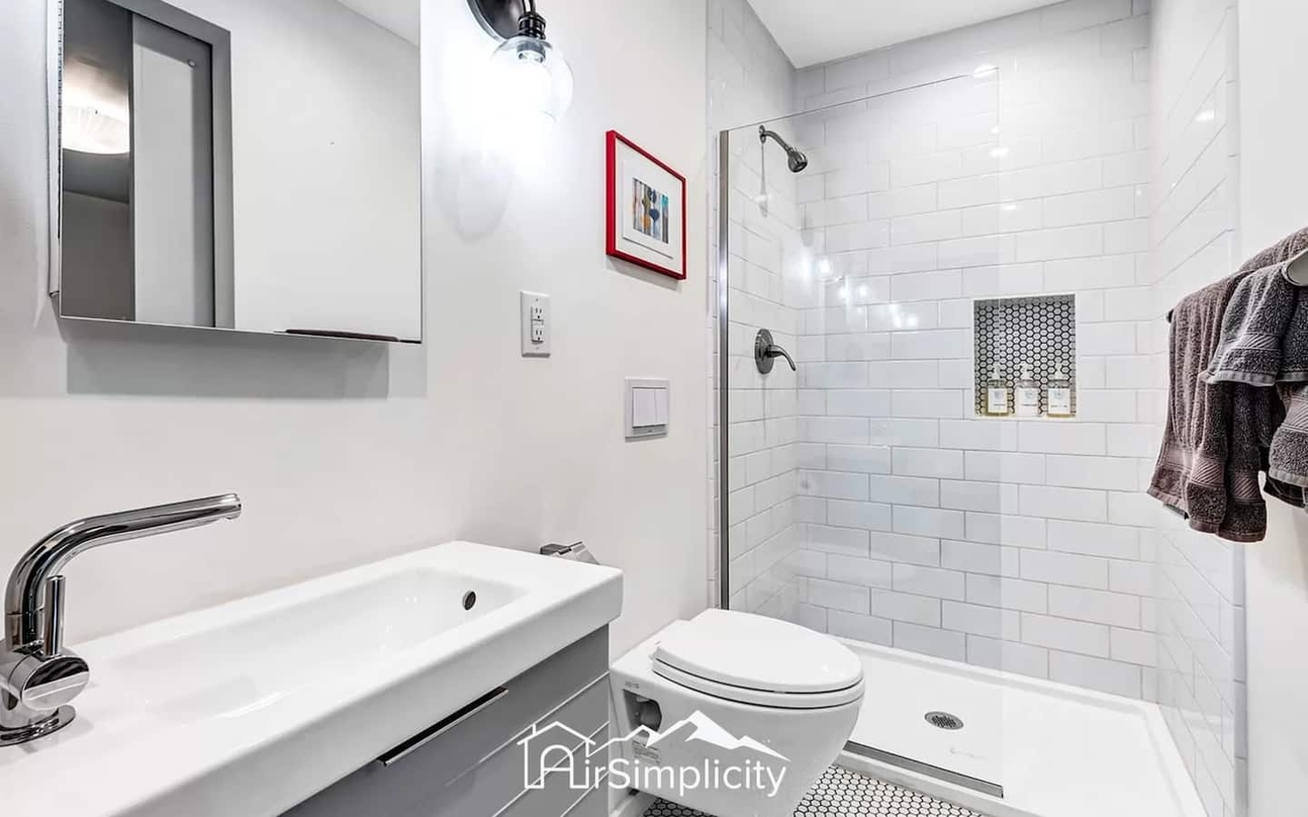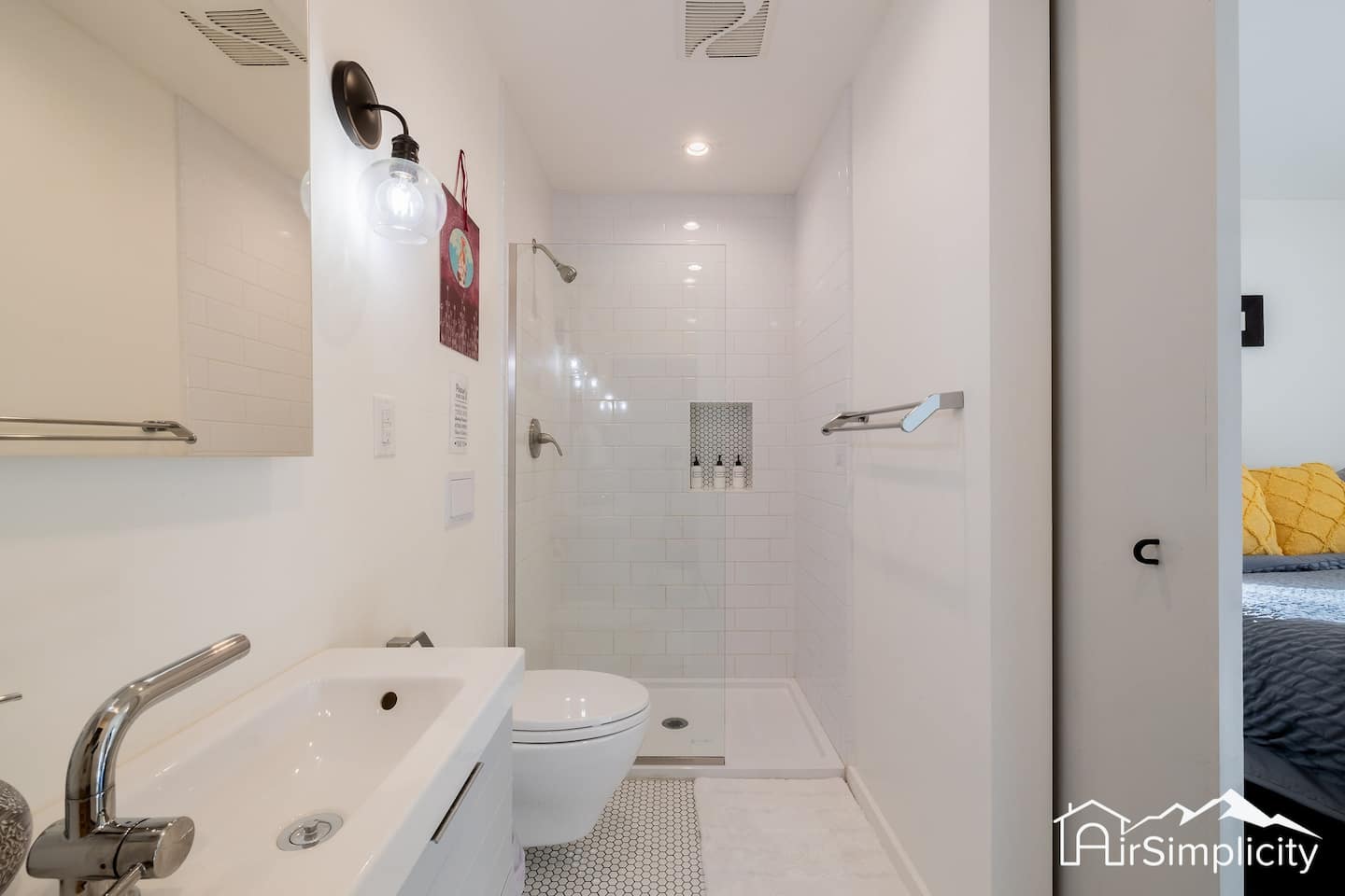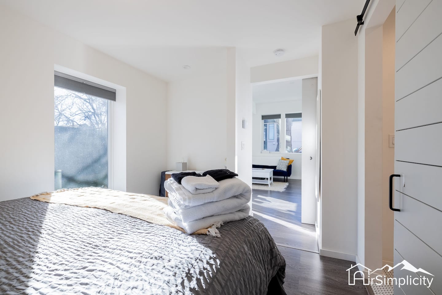 Unwind in the bedroom’s king bed with soft linens, blackout shades, and a private ensuite bath featuring a glass shower and bathroom essentials. Perfect for solo travelers, couples, or digital nomads, the space comfortably accommodates up to three guests.