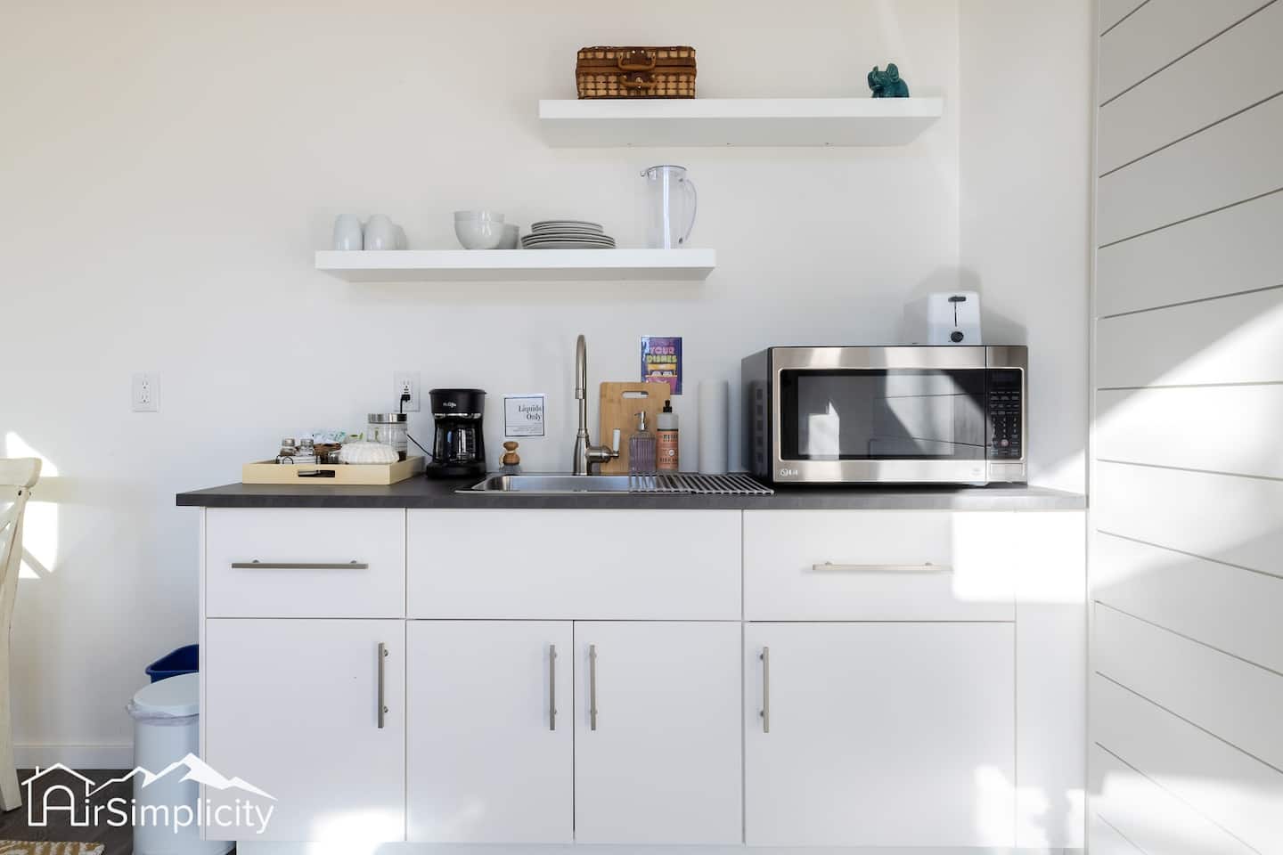 Please note that due to Denver zoning and permit regulations, the kitchenette is not equipped with a stove, cooktop, or oven. However, it is still fully equipped with a microwave, mini-fridge, coffee maker, and all necessary kitchen utensils and dishes for your convenience.