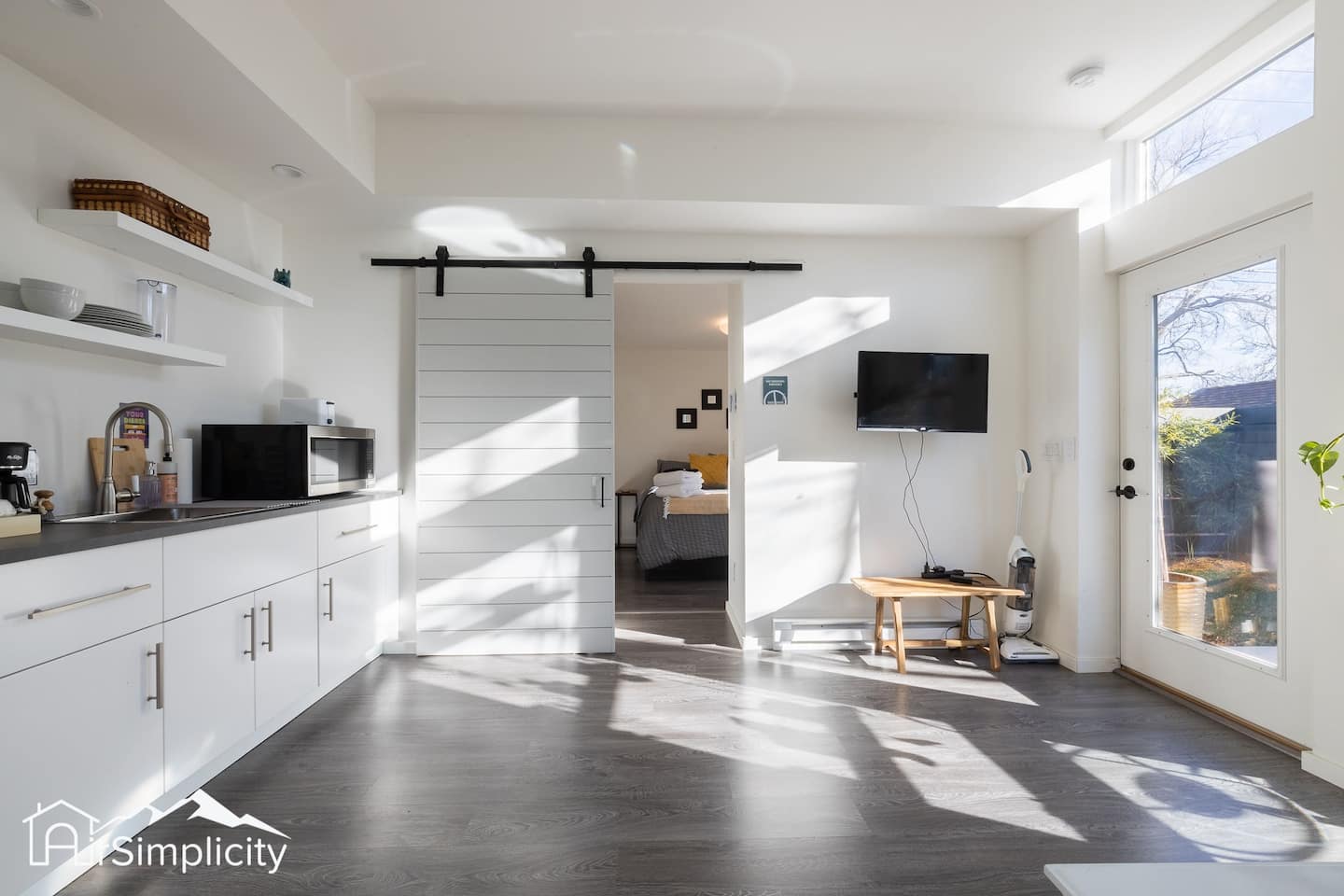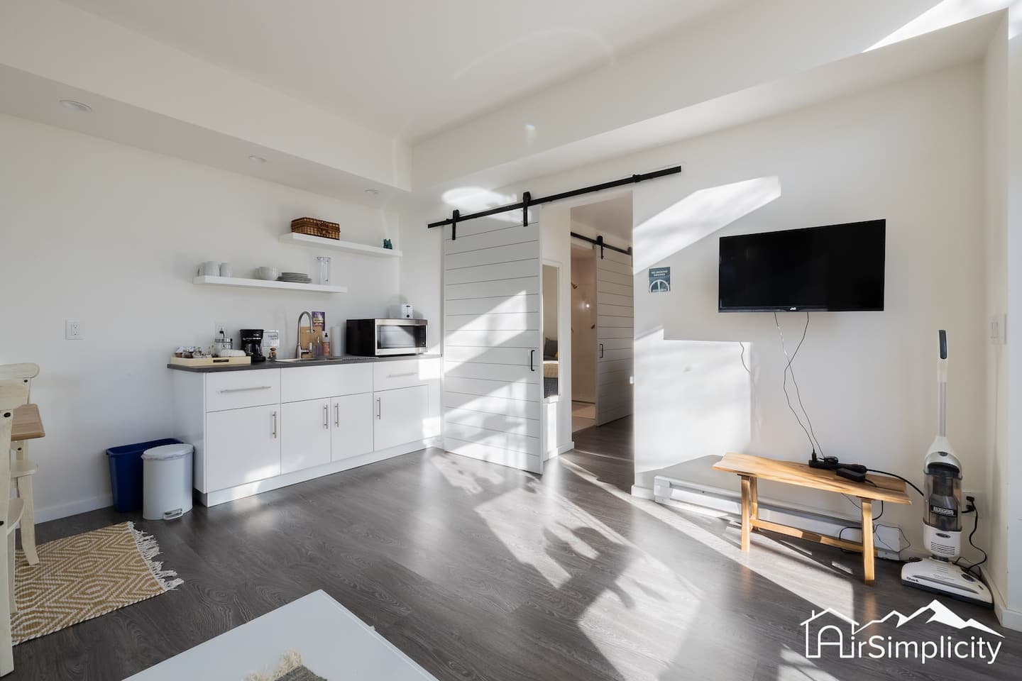 The bright open layout includes a cozy living area where you can relax with a show on the smart TV or enjoy a board game on quiet evenings. Heating and air conditioning ensure year-round comfort, while self check-in with a keypad offers convenience and privacy.