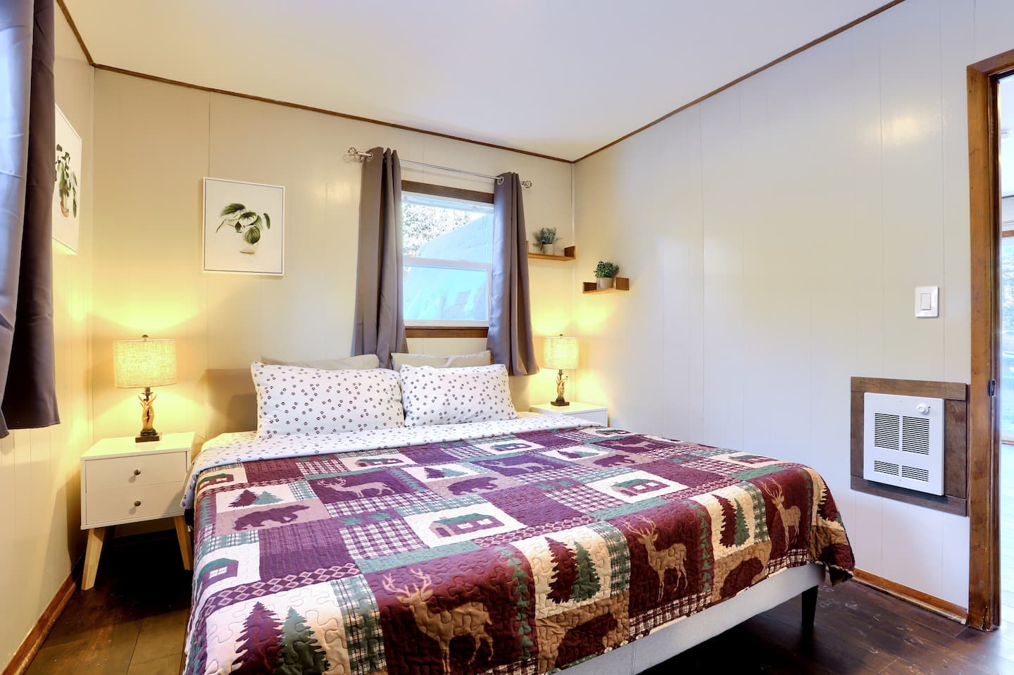 The Bear Den accommodates up to four guests across two bedrooms, each featuring plush Green Leaf memory foam mattresses—one king and one queen. Soft linens, extra blankets, and room-darkening shades ensure restful nights after a day in the high-country air.