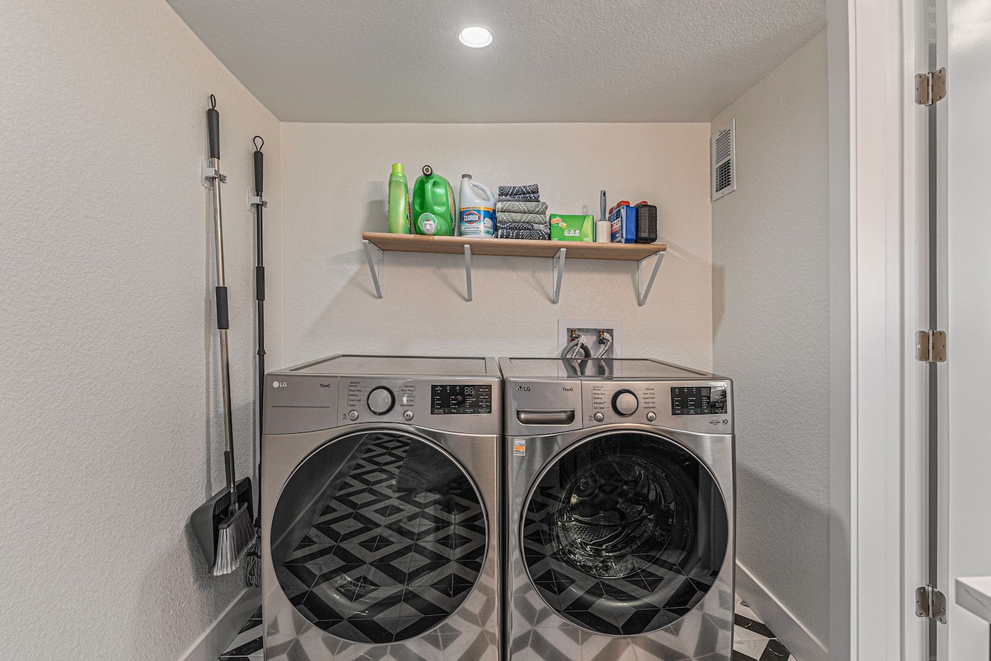 Settle into the comfortable living area, where playful, retro-inspired decor creates a warm, relaxed atmosphere. Enjoy movie nights on the 55-inch TV or gather around the dining table for a shared meal. A washer and dryer are tucked away for easy access during longer stays.