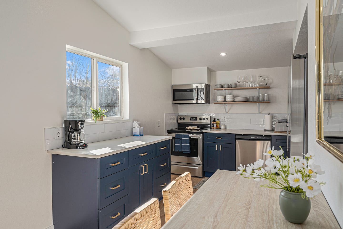 The full kitchen includes everything needed for home-style meals, from a stove and oven to a coffee maker and dishwasher. Cooking basics are provided, along with a dining table perfect for breakfast or dinner together.