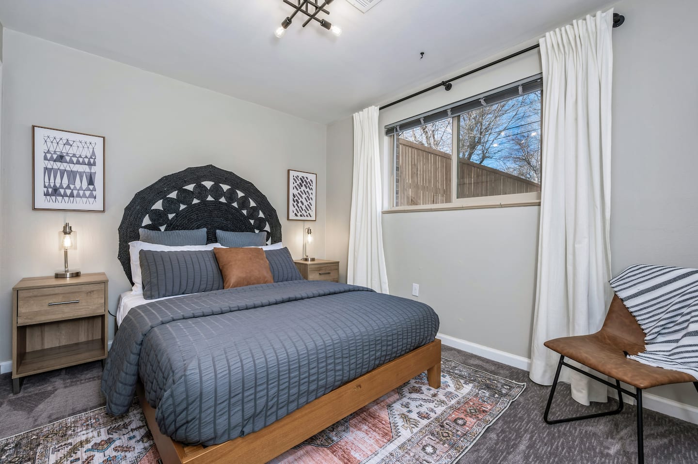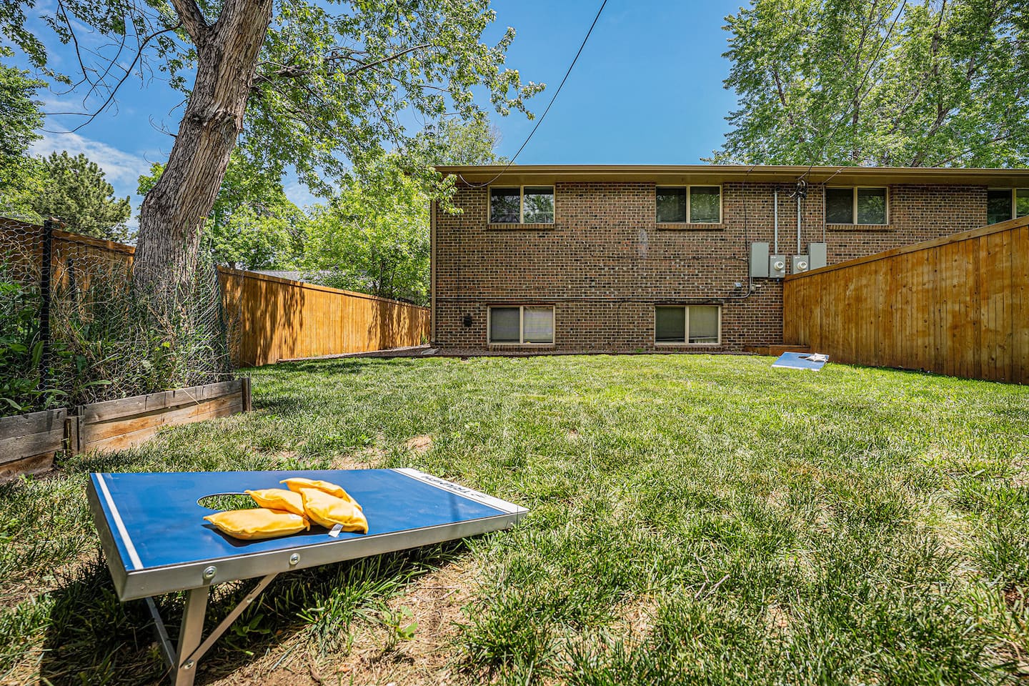 The private fenced yard is set up for relaxation and play. Stretch out in the hammock, settle into the hanging chair, or gather at the patio table for a meal from the grill. Outdoor furniture and games such as corn hole make it easy to enjoy sunny afternoons. Some furniture is stored seasonally, but the yard remains a peaceful space year-round.