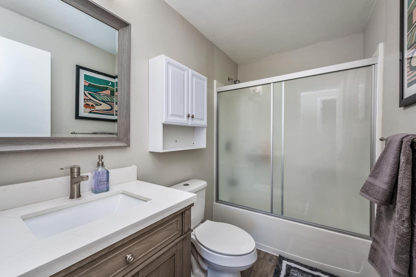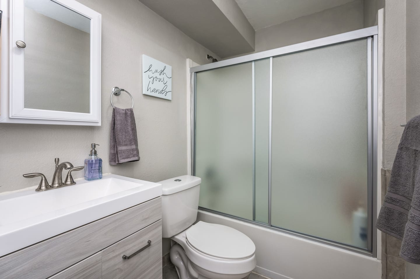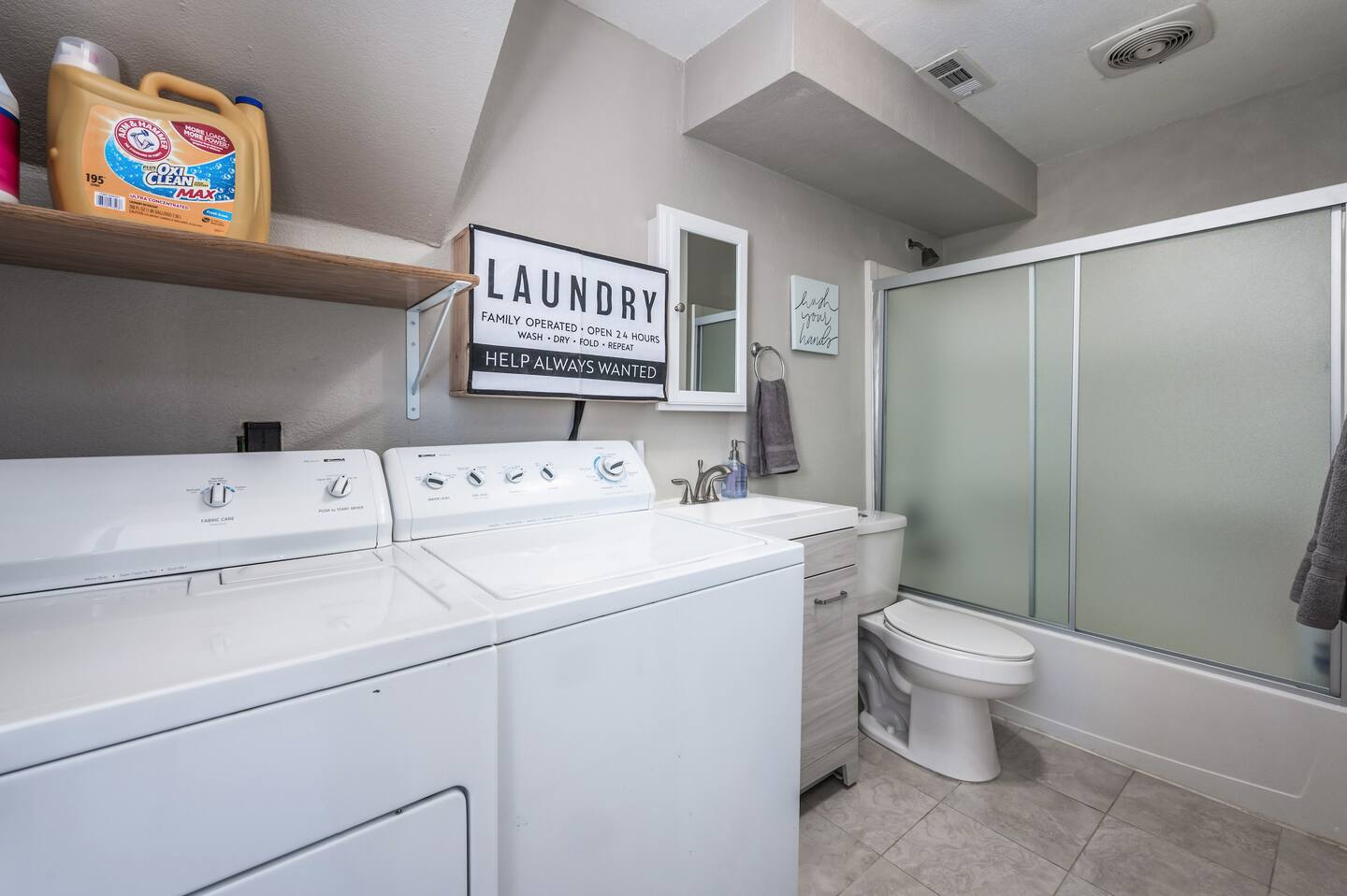 Two full bathrooms each feature a shower/tub combination, stocked with hotel-grade towels, shampoo, conditioner, body wash, and a hair dryer. The downstairs bathroom also doubles as the laundry area. Essentials such as soap, extra pillows, toilet paper, and bed linens are included for ease and comfort.