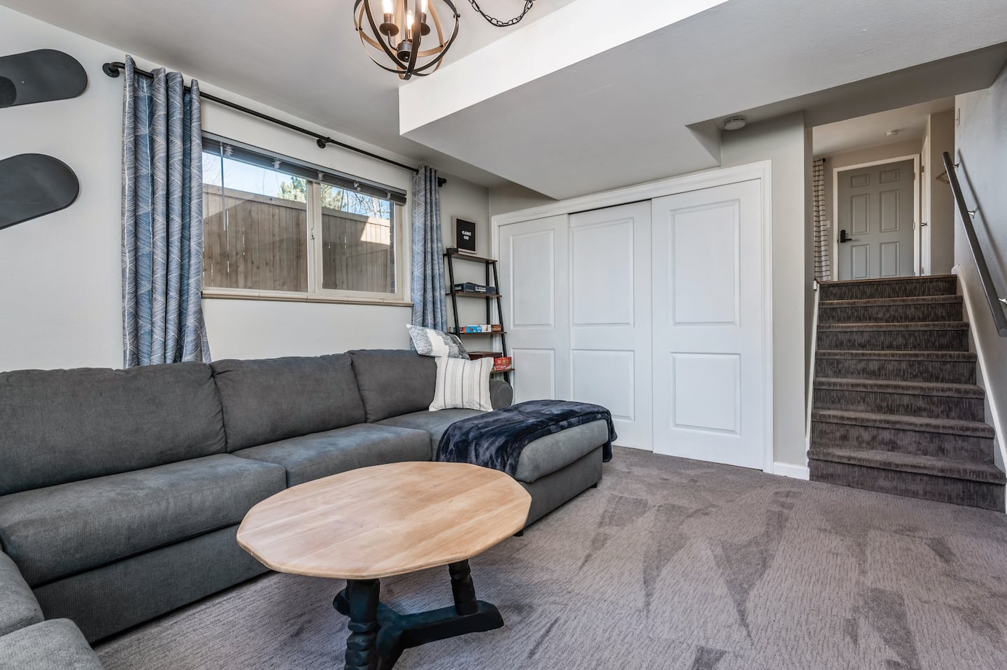 Spread across 1,350 square feet, this duplex offers two living rooms, each designed for gathering or quiet relaxation. The main floor living room has an oversized sectional, leather chairs, and a 65-inch Smart TV ready for streaming. Downstairs, a lounge with board games provides space for family time. High-speed WiFi and an Ethernet connection support both work and leisure, and the washer and dryer add convenience for longer stays.