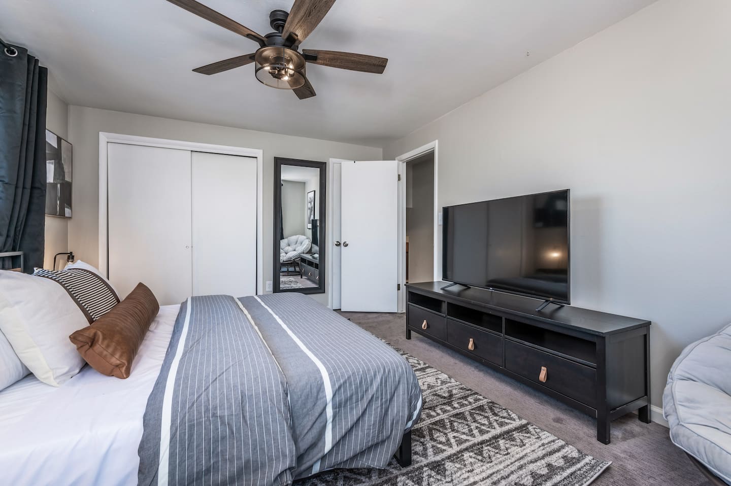 Three restful bedrooms provide space for up to six guests. The upstairs primary suite features a king bed, massage recliner, boho chair, and large TV for unwinding at the end of the day. A second upstairs bedroom includes a queen bed and storage, while the downstairs bedroom offers another queen bed. All are furnished with memory foam mattresses, blackout curtains, and soft linens for restful nights.