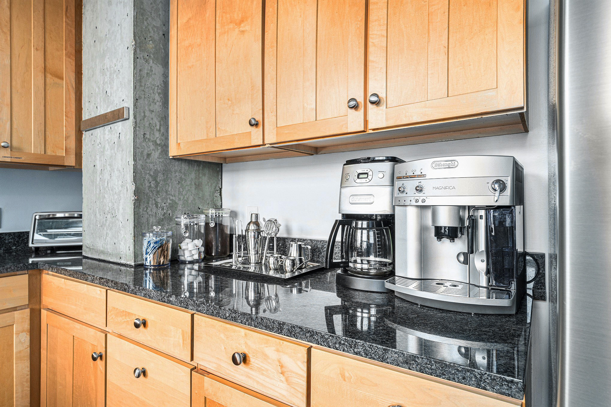 The kitchen is stocked with everything you need to cook like a pro, from cookware, toaster over and bakeware to basic spices, and cleaning supplies. Start your mornings with the drip coffee maker or the espresso machine, complete with a generous supply of complimentary coffee.