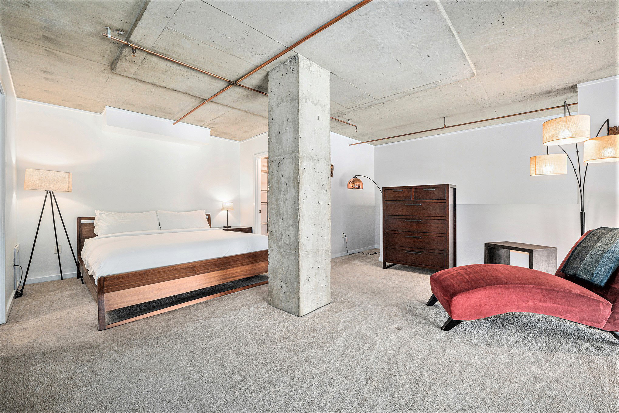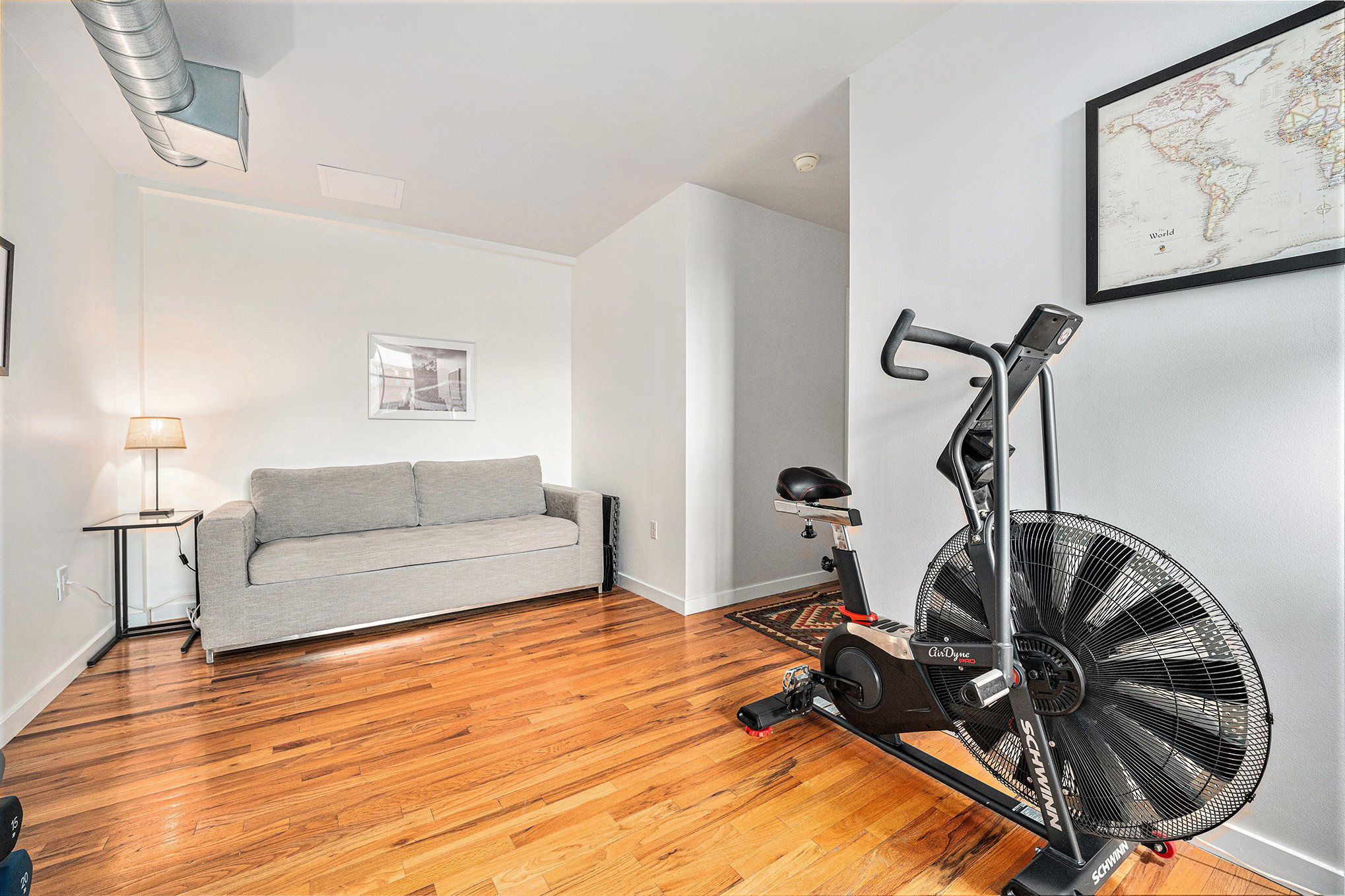 Off the main living area you will find a desk and office chair for remote working and a stationary bike. There is a second seating area with a couch that converts to a full size pull-out bed. Please note that this in an open space without a door.