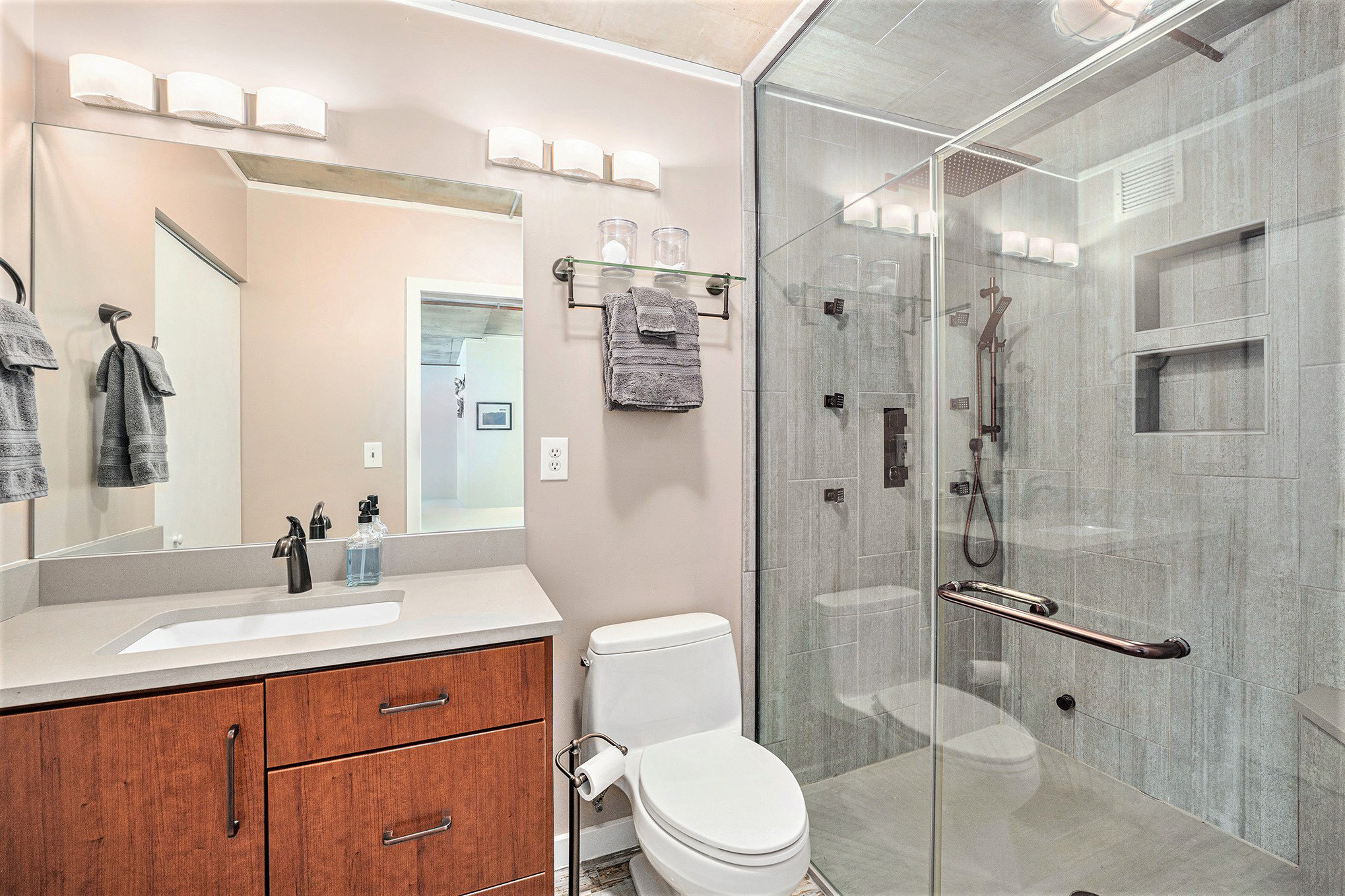 The bathrooms feature premium shampoo, conditioner, body wash, a hair dryer, and plush towels to add a touch of luxury.